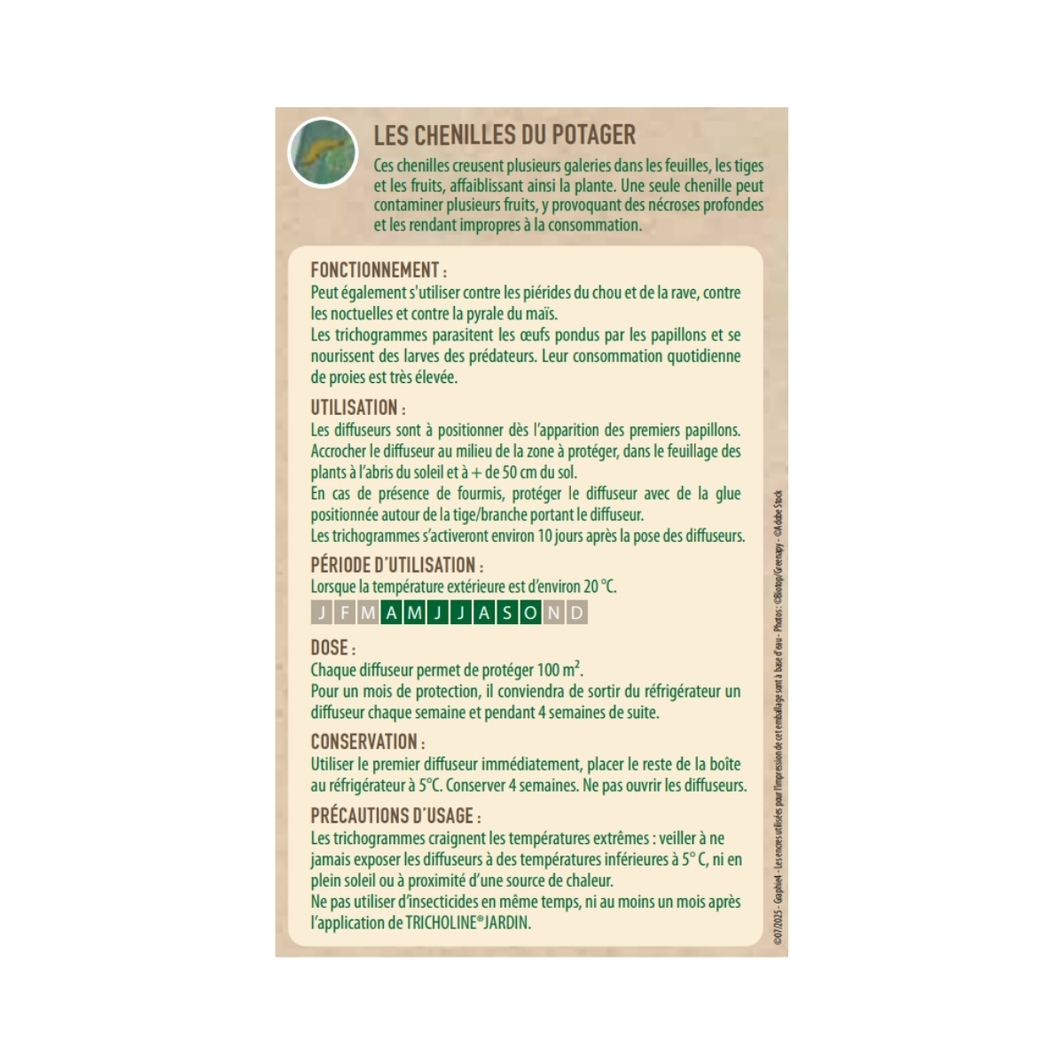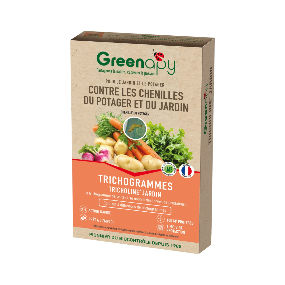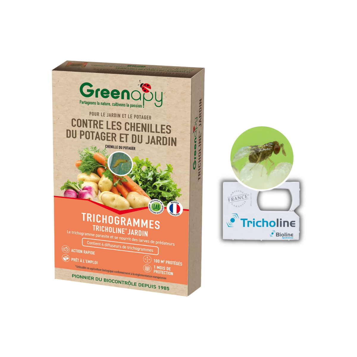 Tricholine Jardin est un auxiliaire du jardin qui contrôle naturellement les chenilles polyphages et défoliatrices ainsi que d'autres ravageurs nuisibles tels que les piérides du chou et de la rave, et les pyrales du maïs. C'est un trichogramme, un parasitoïde de la famille des hyménoptères, qui pond ses œufs dans les œufs des ravageurs. Les nouveaux trichogrammes sortent ensuite de ces œufs à la place des chenilles, permettant ainsi une réduction rapide des nuisibles. Tricholine Jardin est livré dans une boîte contenant 4 diffuseurs, chacun offrant une protection d'une semaine pour environ 100m².