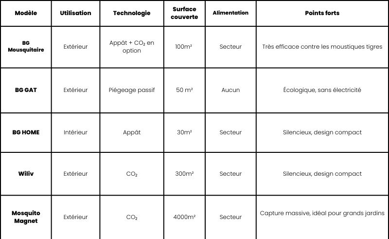 Certains pièges sont spécifiquement conçus pour une utilisation en extérieur, comme les modèles fonctionnant au CO₂ ou les pièges passifs, tandis que d’autres sont plus adaptés à une utilisation intérieure grâce à la lumière UV et aux systèmes d’aspiration.