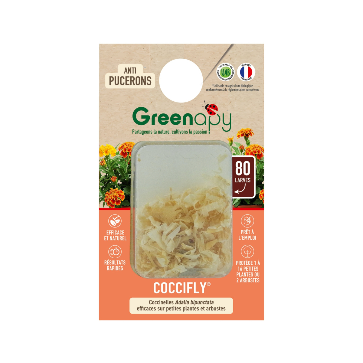 Les larves de coccinelle Coccifly® sont une solution écologique et efficace pour lutter contre les pucerons. Ces auxiliaires de jardin consomment les pucerons à tous les stades (larves, aptères, ailés) et aident à préserver vos cultures sans produits chimiques. Une larve peut engloutir jusqu'à 60 pucerons par jour, assurant ainsi une protection active et durable.