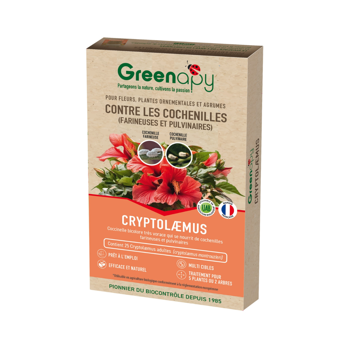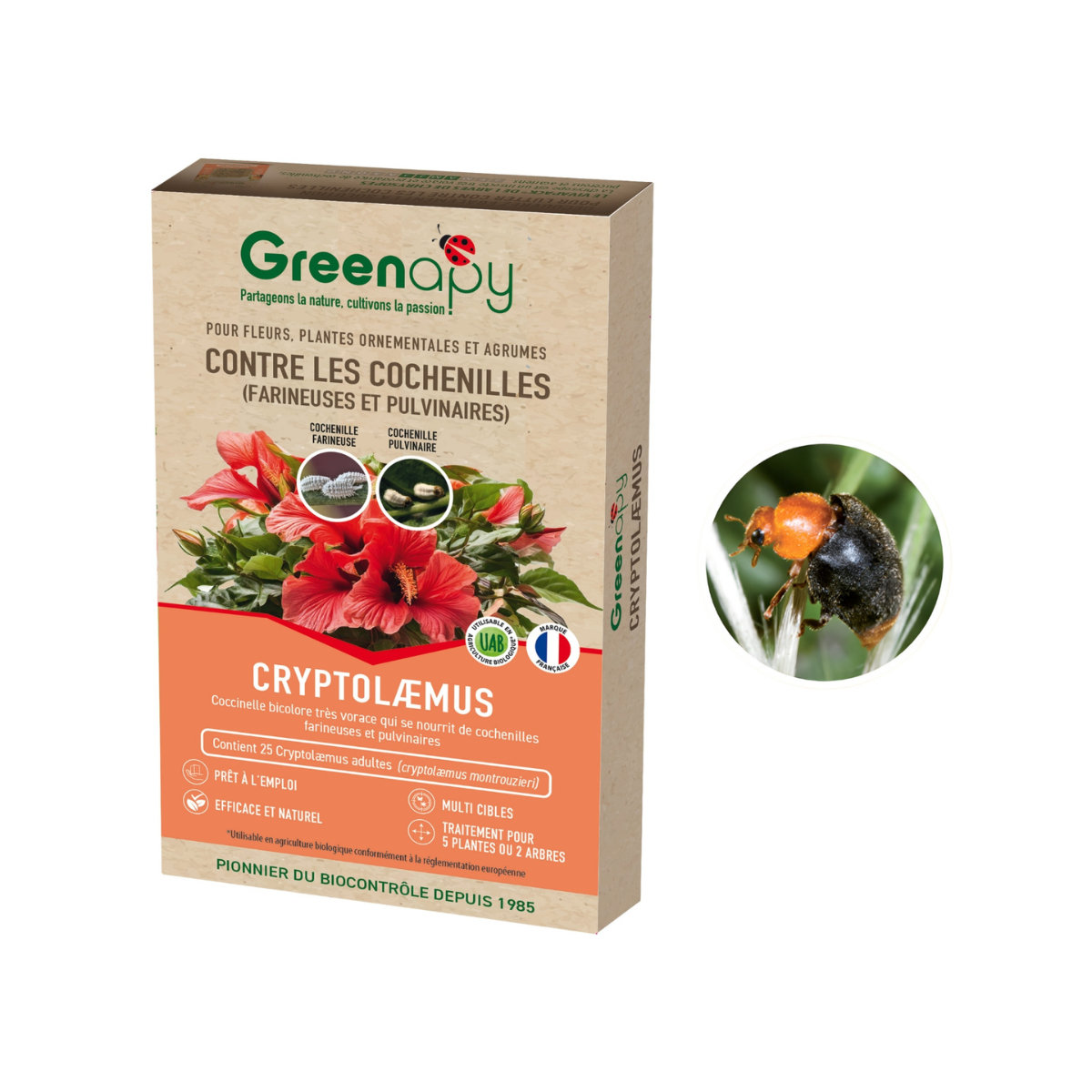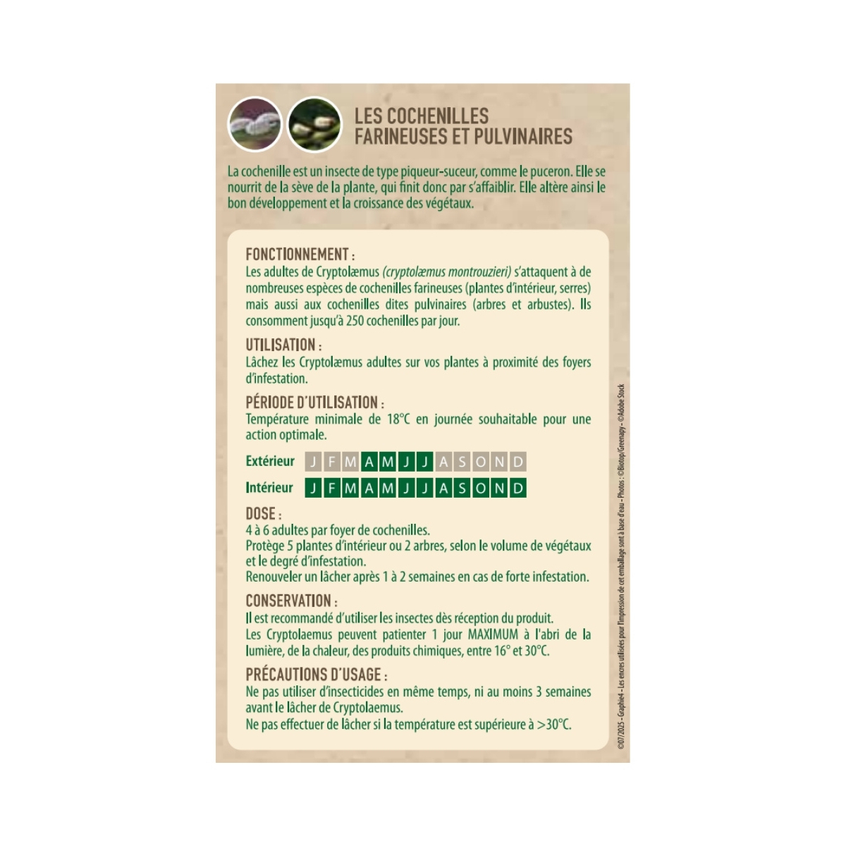 Cette espèce de coccinelles est à utiliser pour la lutte biologique, c'est la principale prédatrice des cochenilles farineuses de votre jardin. Les Cryptolaemus repèrent les cochenilles pour se nourrir. Elles vont également pondre près des foyers des cochenilles tout au long de leur vie (2 mois), jusqu’à 400 œufs.