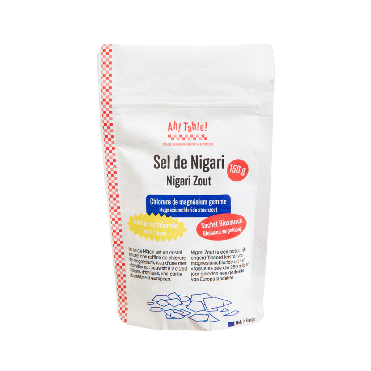 Le format 150 g est idéal pour une première utilisation ou un usage ponctuel. Le sel de Nigari est conditionné dans un doypack refermable 100 % compostable, en accord avec une démarche éco-responsable.