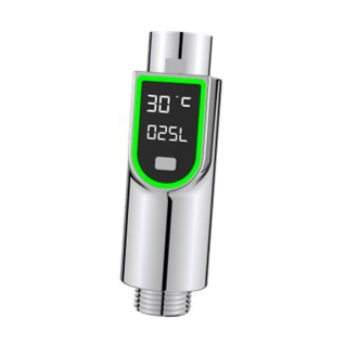 Compteur d’eau de douche Ekogest : affichage instantané de la consommation et de la température, régulateur 9 L/min, LED verte/jaune/rouge, installation facile, sans pile grâce à une dynamo, certifié ACS.