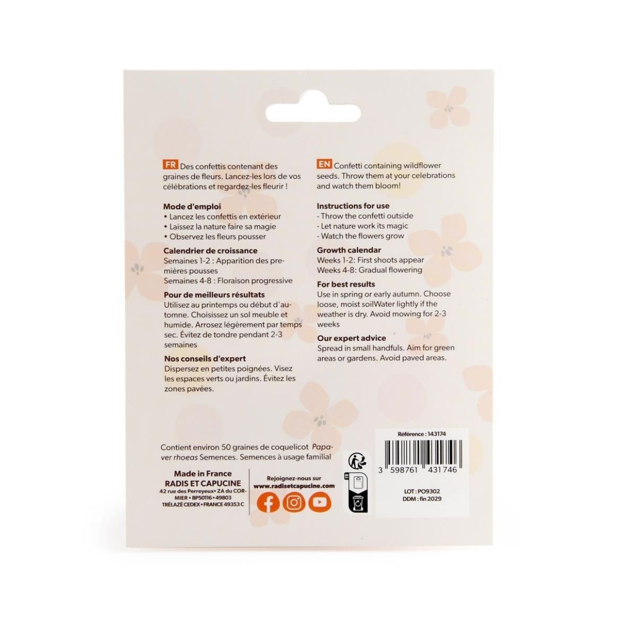 Ces confettis se désagrègent naturellement après arrosage et laissent place à des fleurs variées comme le coquelicot, le bleuet, le cosmos ou d'autres fleurs des champs. Ils remplacent avantageusement les confettis plastiques ou métallisés, tout en laissant un doux souvenir durable : celui d’un jardin fleuri. Un petit geste festif, super écologique et riche de sens.