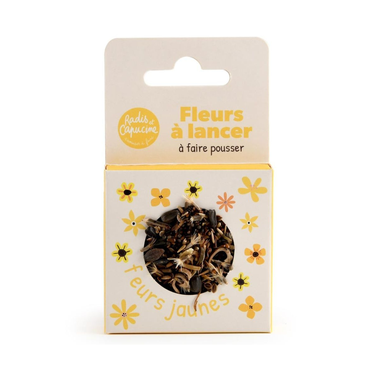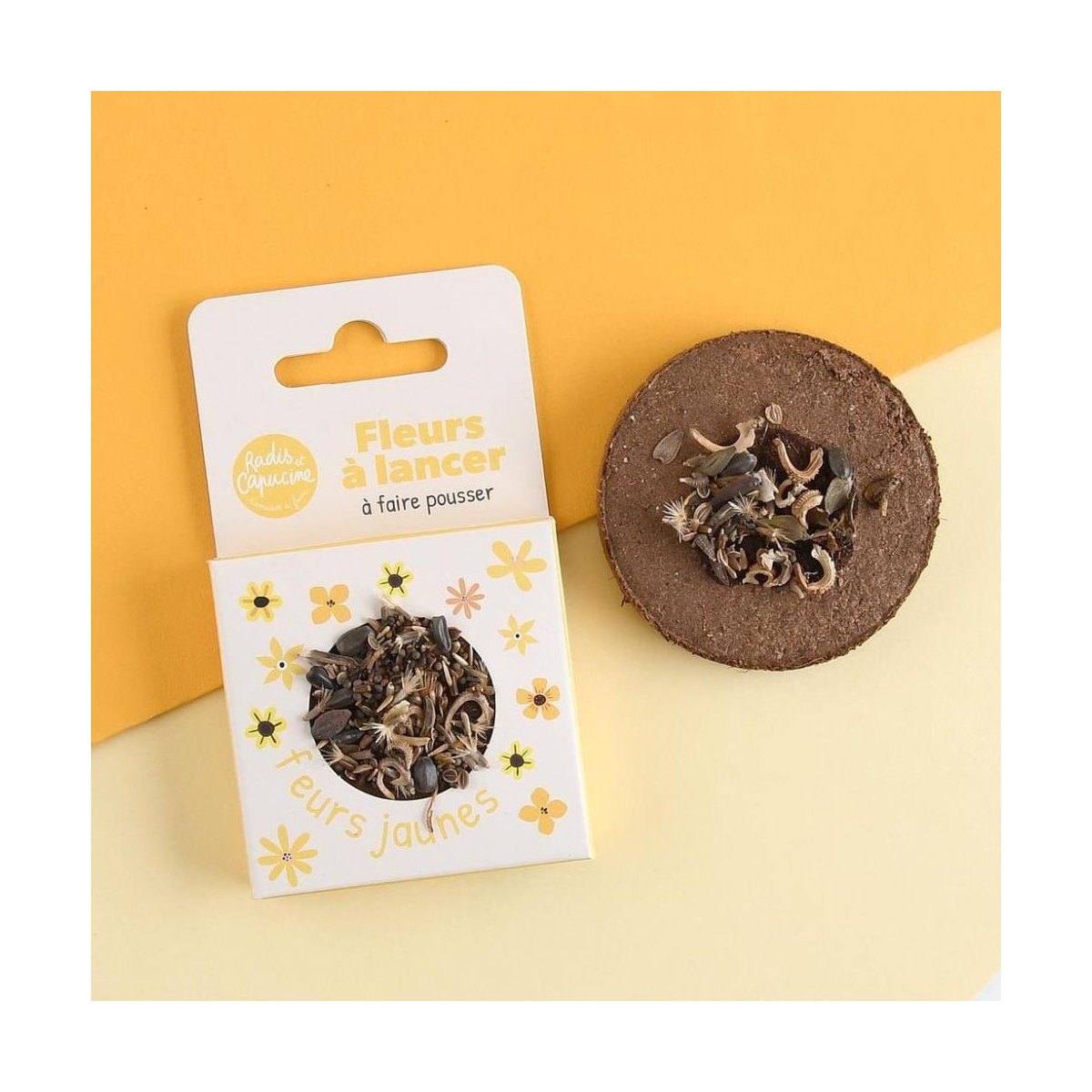 - Contenu : 1 plaquette de terre de coco fertilisée avec graines de fleurs jaunes