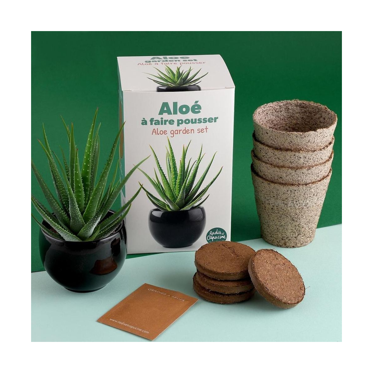 - Contenu : 1 pot de culture, terreau, graines d’Aloe vera