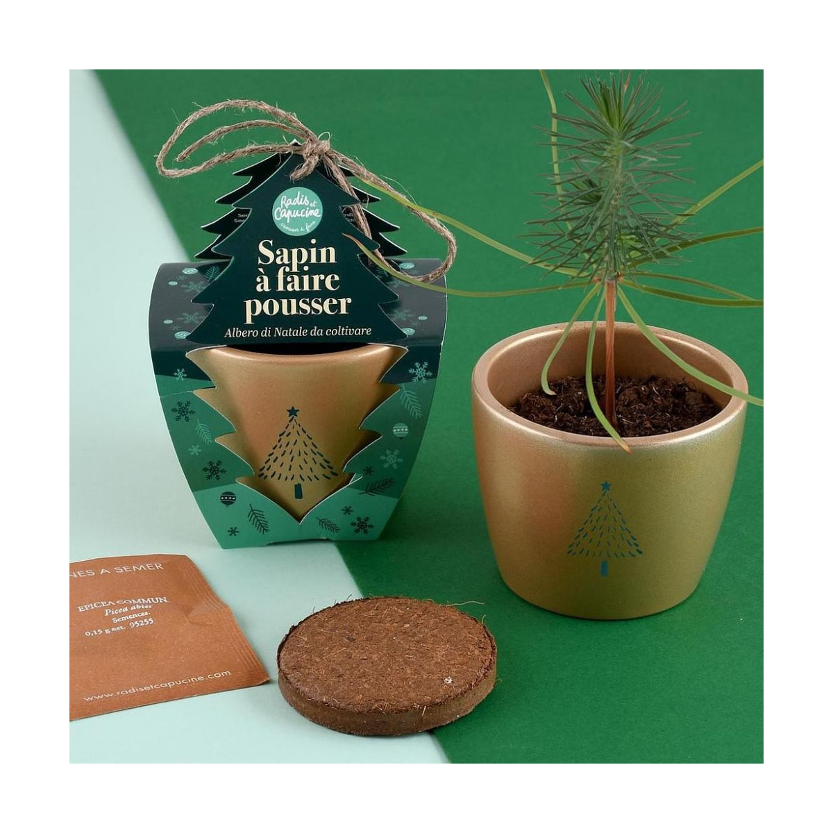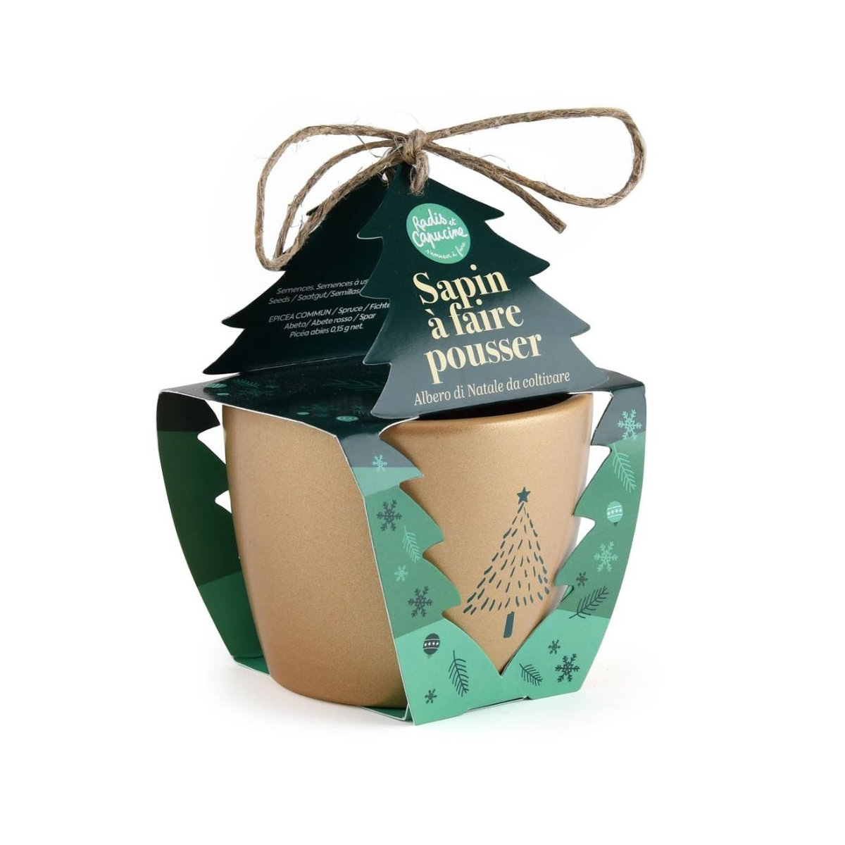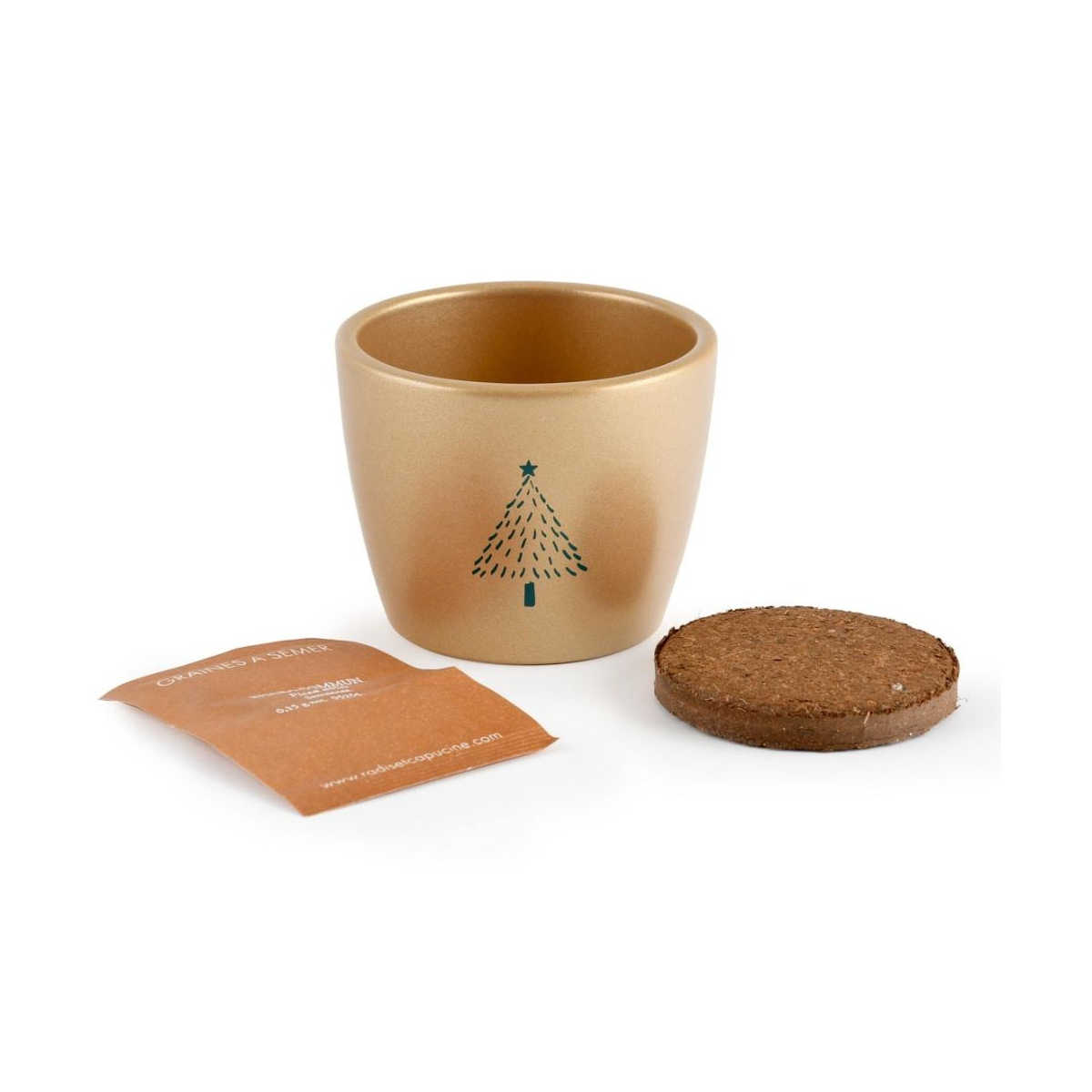 - Contenu : 1 pot doré de 8 cm, terreau, graines d’épicéa