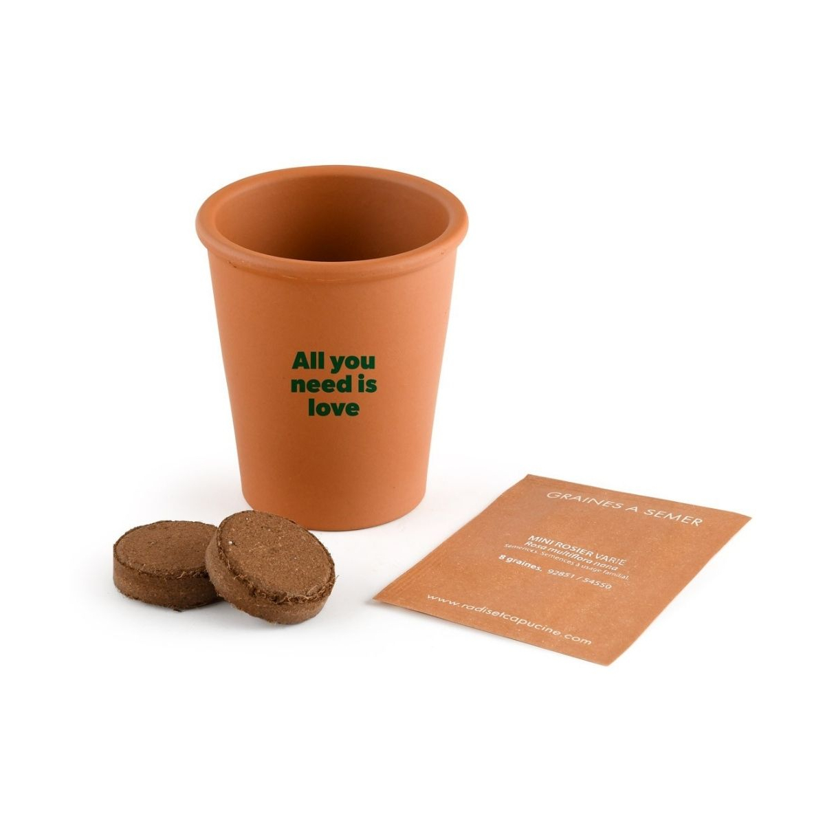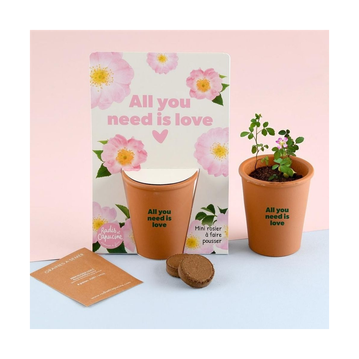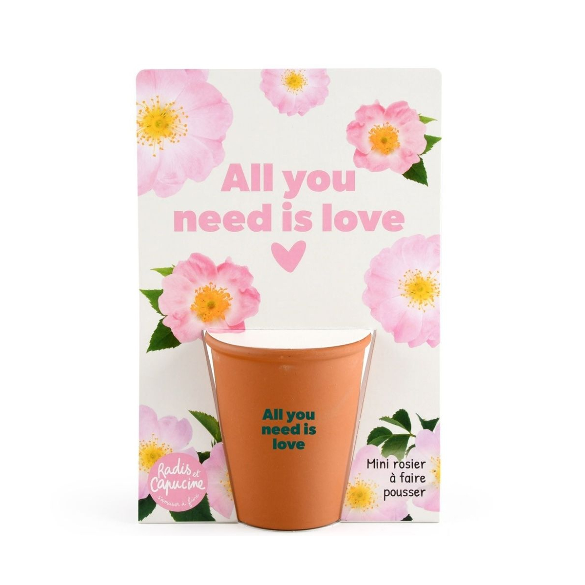 Carte message "All you need is love" avec kit pour faire pousser un rosier. Un cadeau romantique et poétique, facile à cultiver, idéal pour offrir amour, tendresse et fleurs colorées à vos proches.