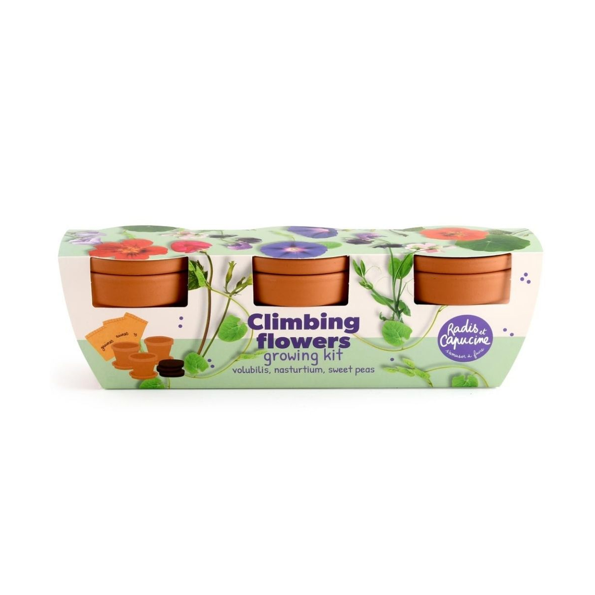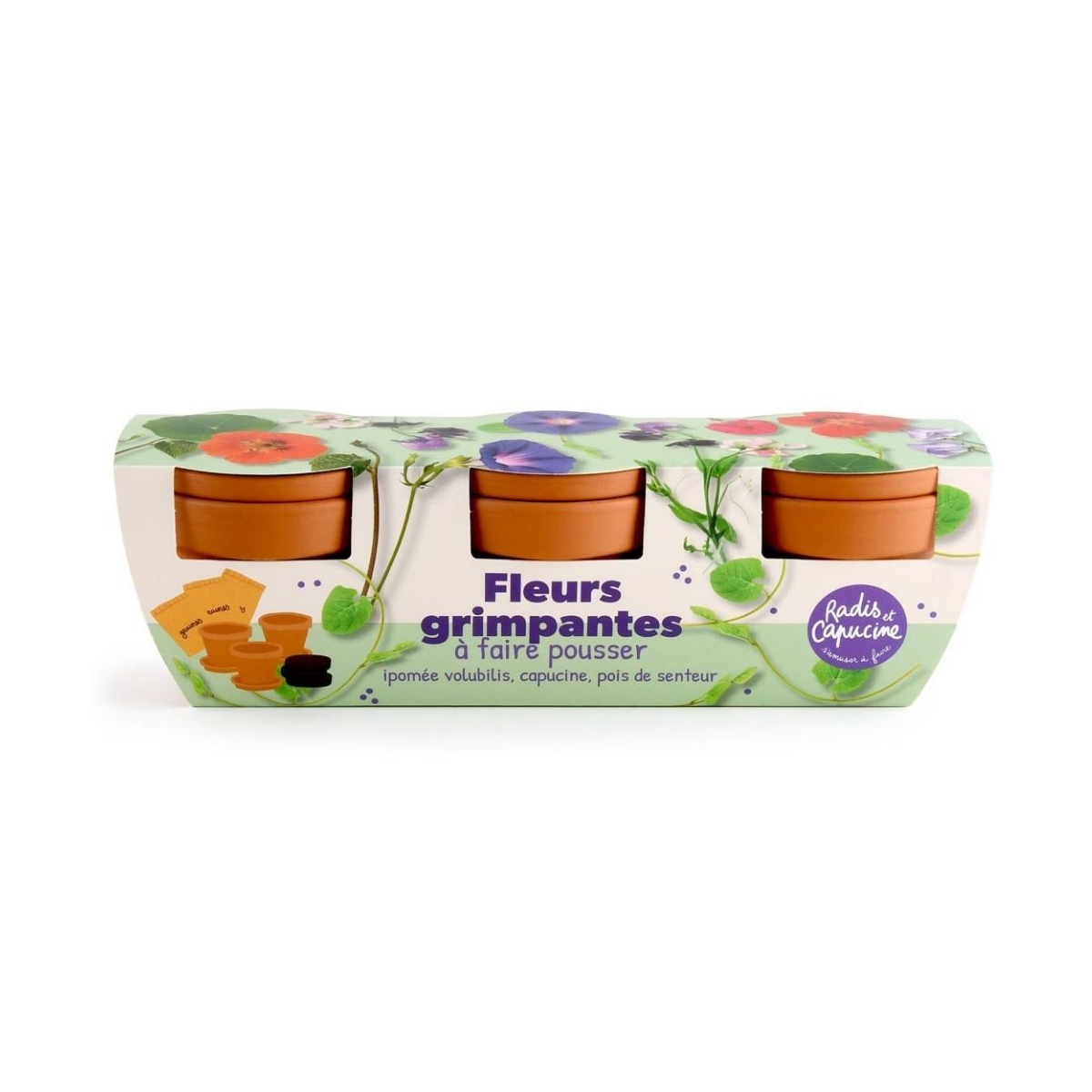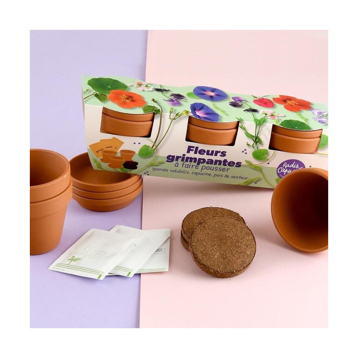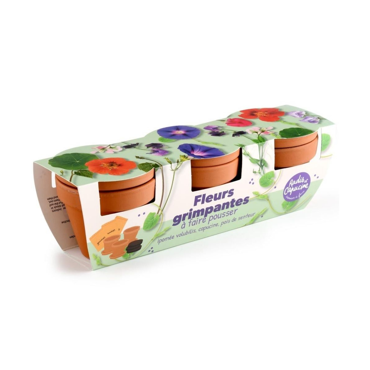 Kit jardinage fleurs grimpantes – trio volubilis, capucine et pois de senteur. Un cadeau poétique et facile à cultiver, idéal pour créer un coin fleuri et parfumé sur balcon, terrasse ou rebord de fenêtre.