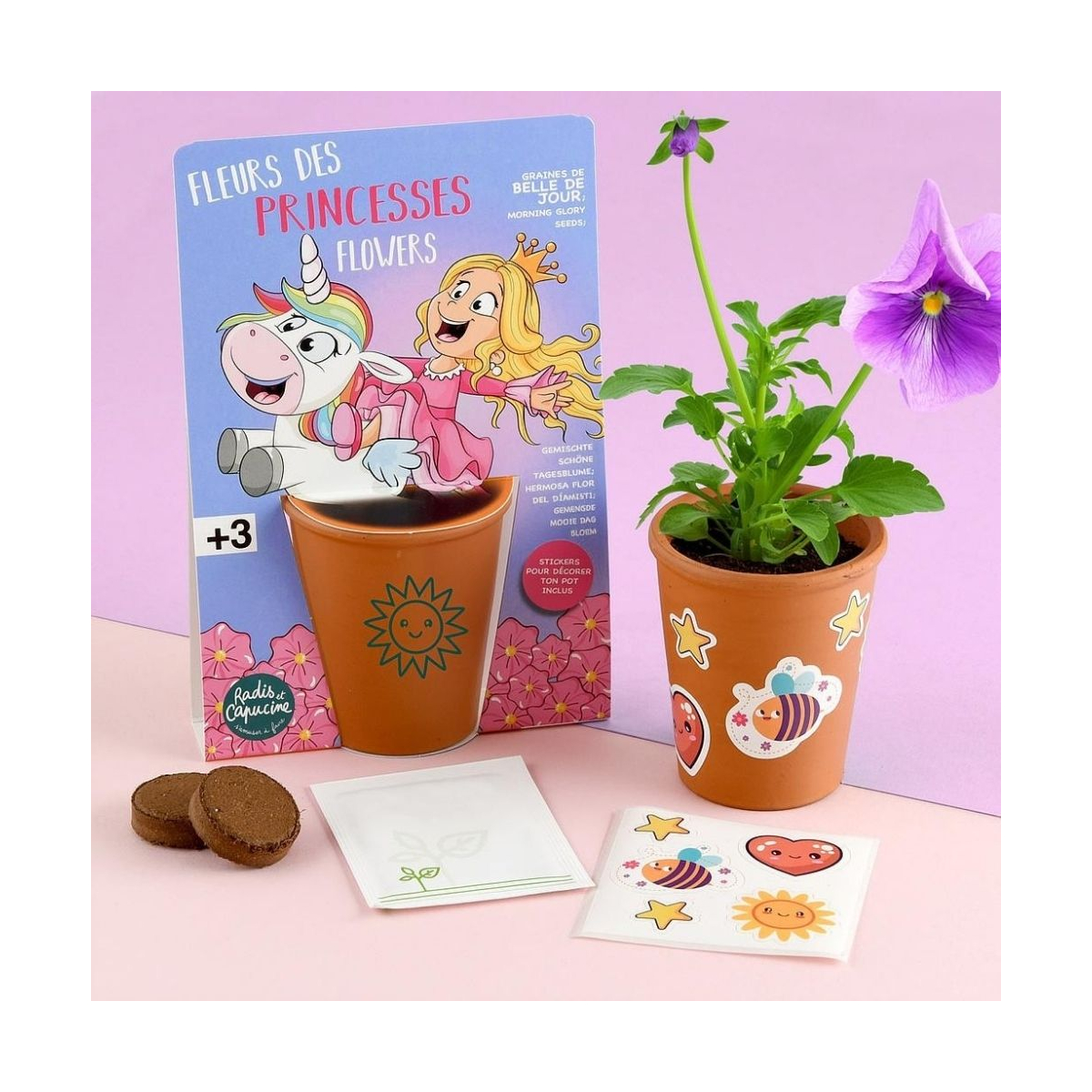 Kit jardinage enfants – Princesse et fleur Belle de jour. Cultivez facilement à l’intérieur et découvrez la magie du jardinage avec ce kit ludique et féerique.