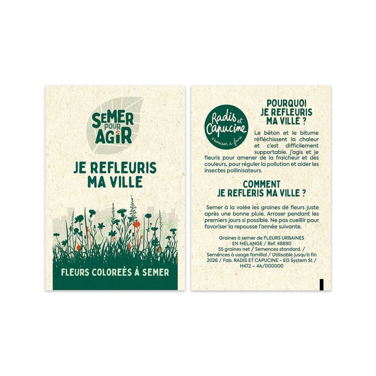 Sachet « Semer pour agir – Je refleuris ma ville » avec graines de fleurs mellifères. Un cadeau d’entreprise engagé pour refleurir les villes, soutenir les pollinisateurs et améliorer la qualité de vie urbaine.