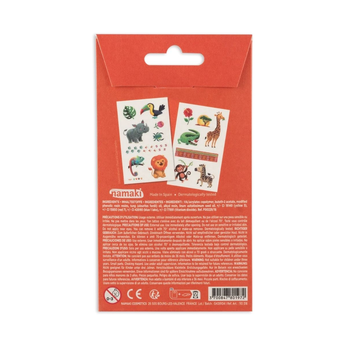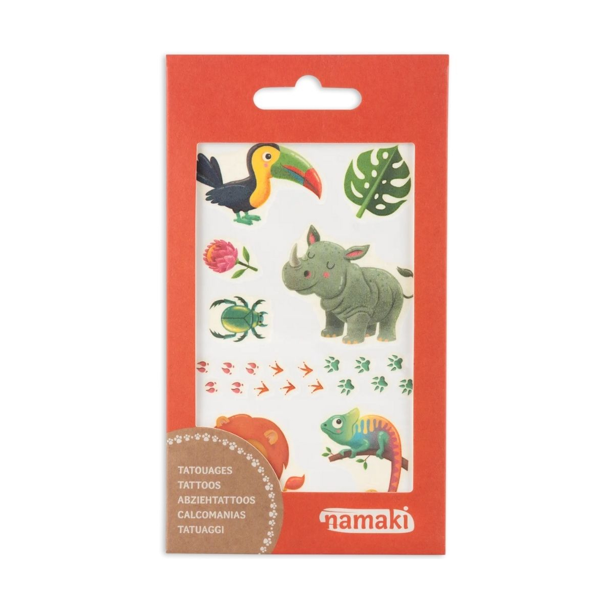 Apportez une touche d’originalité au déguisement avec les tatouages temporaires Vie sauvage. Inspirés par l’univers de la nature et imaginés par Namaki, ces motifs colorés s’appliquent facilement sur un bras, une main ou une jambe pour compléter un look festif ou laisser libre cours à la créativité. Illustrations exclusives de Pascale Constantin pour des dessins uniques et ludiques.