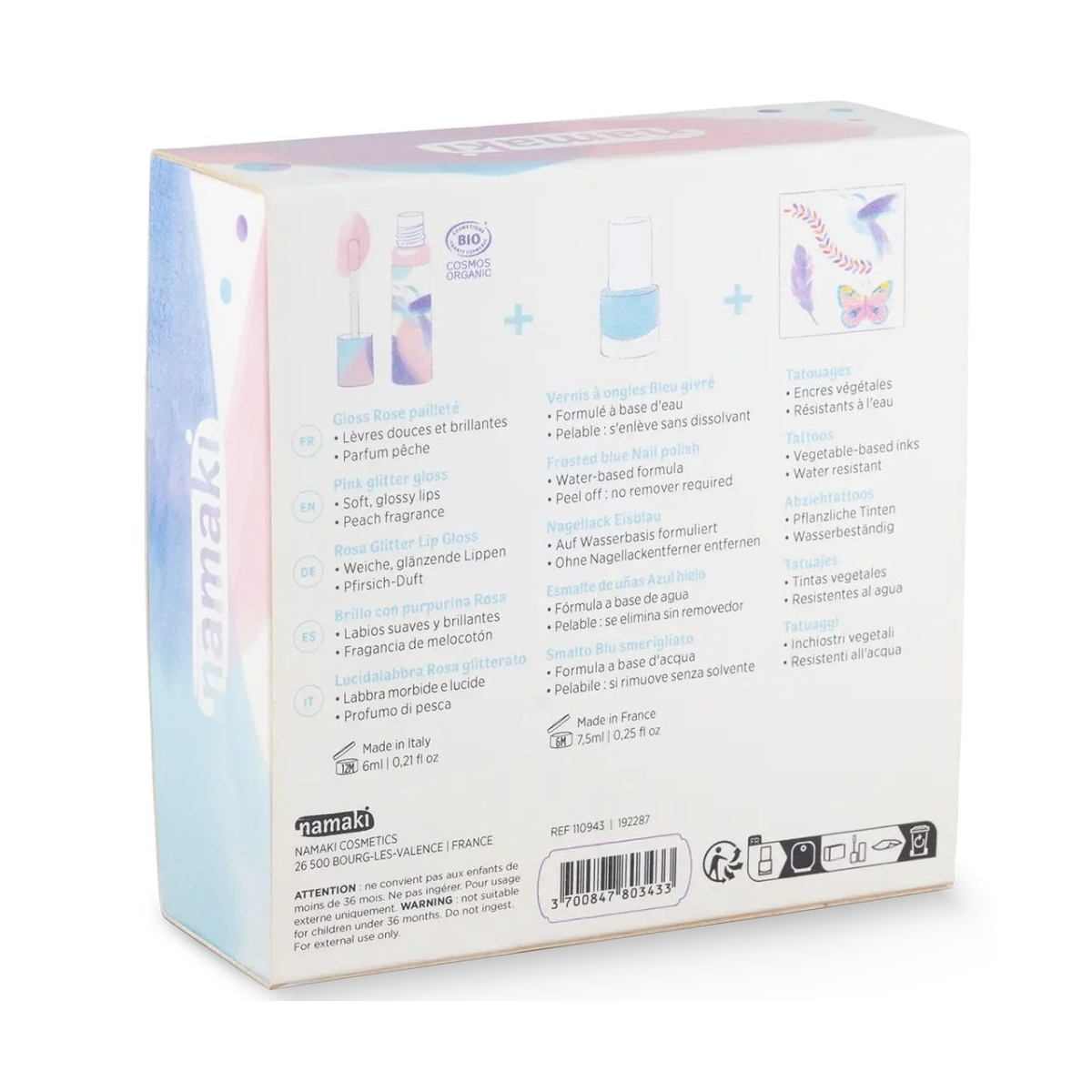 Coffret Trio – Colibri de Namaki. Gloss parfumé à la pêche, vernis bleu givré et planche de tatouages éphémères, tous formulés naturellement et certifiés Cosmos Organic pour des enfants créatifs et protégés.