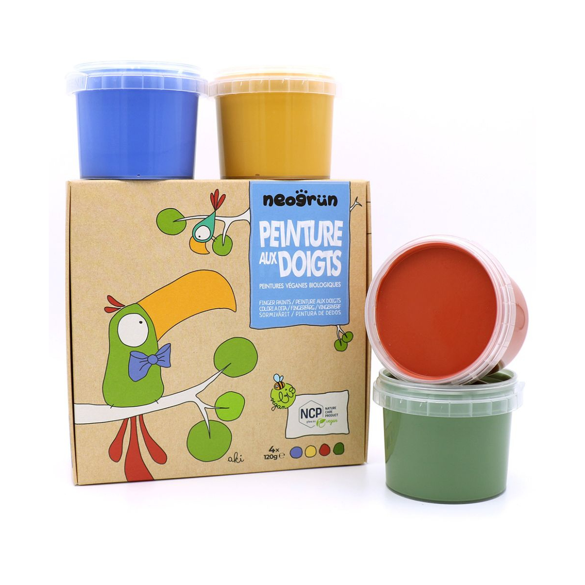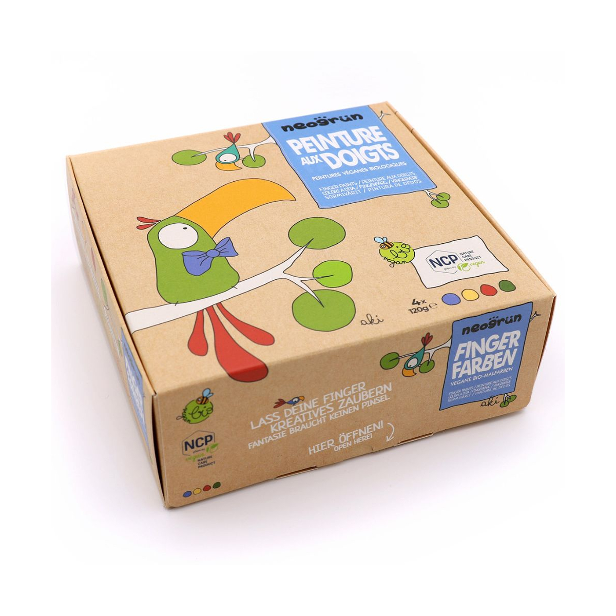 Boîte de peinture aux doigts neogrün® – 4 couleurs primaires naturelles, vegan et lavables, pour éveiller la créativité des enfants dès 3 ans, fabriquée en Allemagne.
