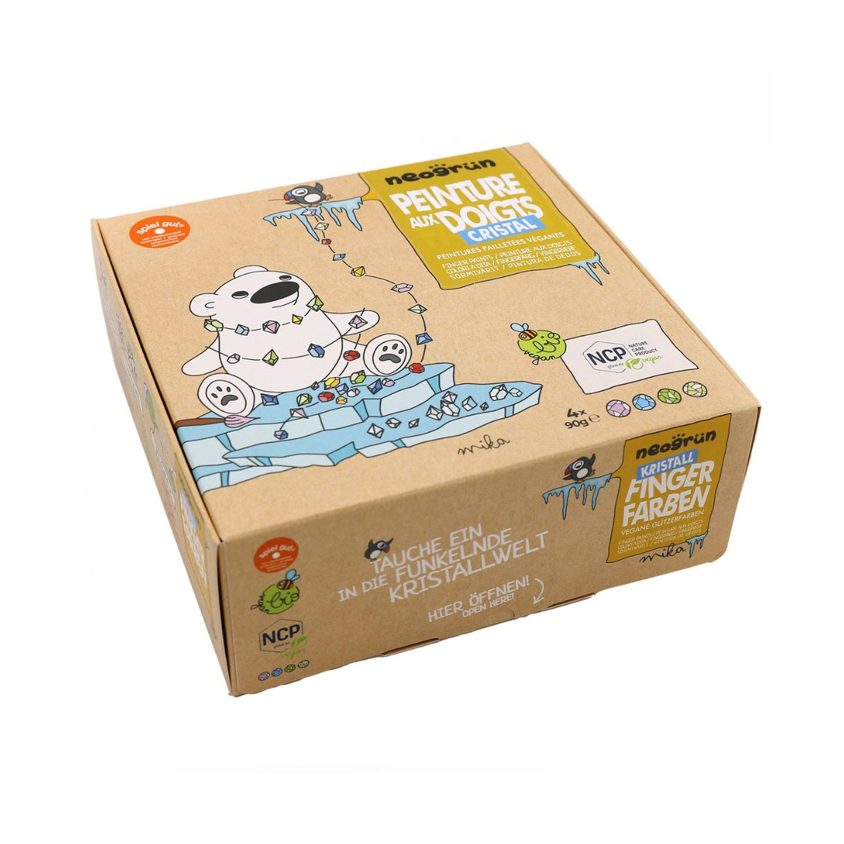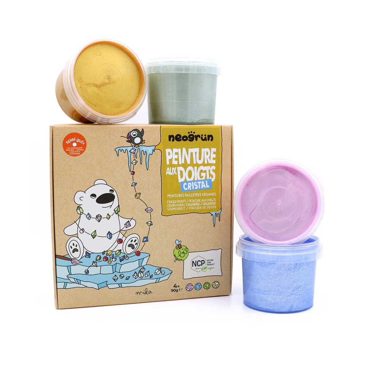 Boîte de peinture aux doigts neogrün® scintillantes – 4 couleurs pailletées naturelles, vegan et lavables, pour stimuler la créativité des enfants dès 3 ans, fabriquée en Allemagne.