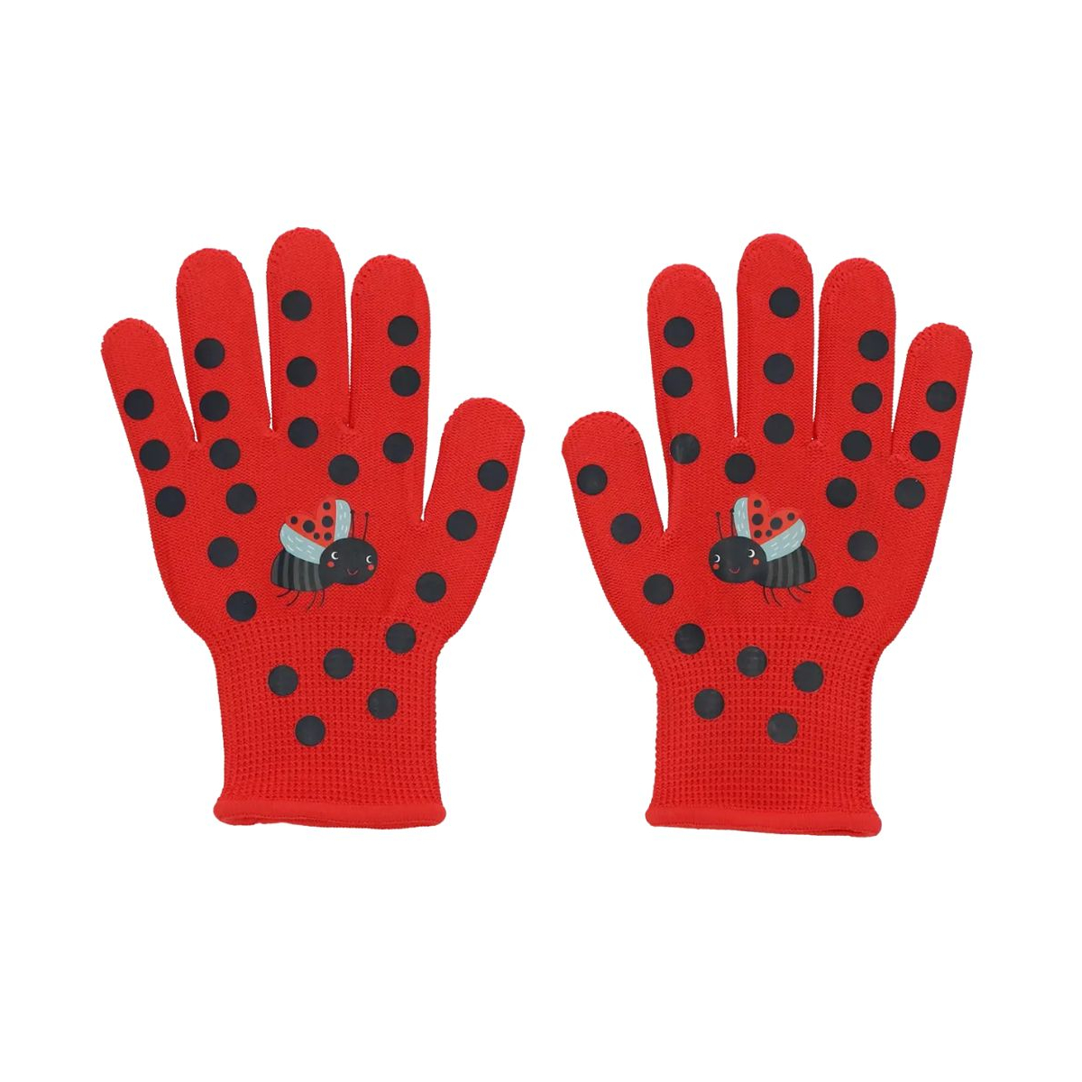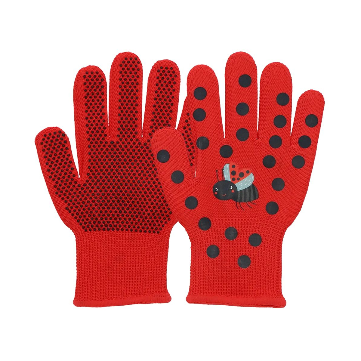 Gants enfants coccinelle avec poignets élastiques et picots en PVC. Protection, adhérence et motif joyeux pour le jardinage et les activités extérieures.