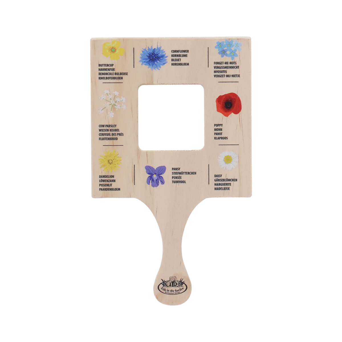 Cadre explorateur fleurs en bois avec poignée, imprimé recto verso en 7 langues. Idéal pour aider les enfants à observer et identifier les fleurs en balade.