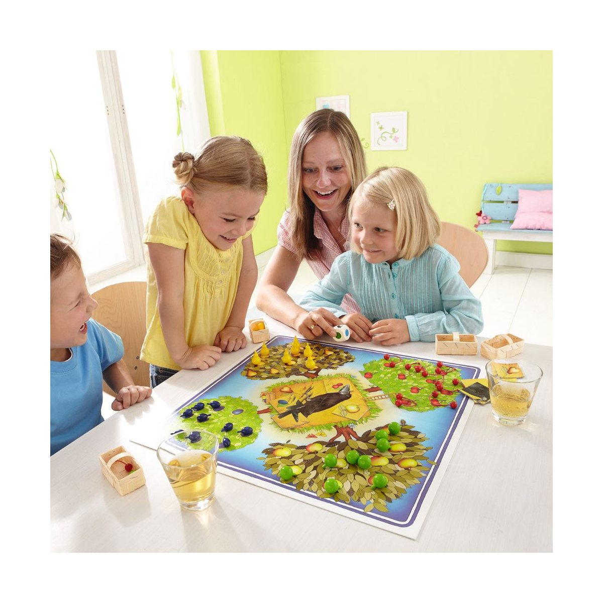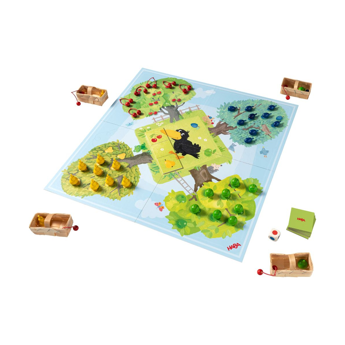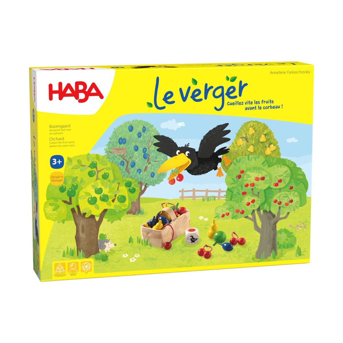 Découvrez Le Verger de HABA, un jeu coopératif dès 3 ans. Ensemble, cueillez les fruits avant le corbeau ! Pièces en bois, règles simples et parties rapides pour un moment ludique et éducatif.