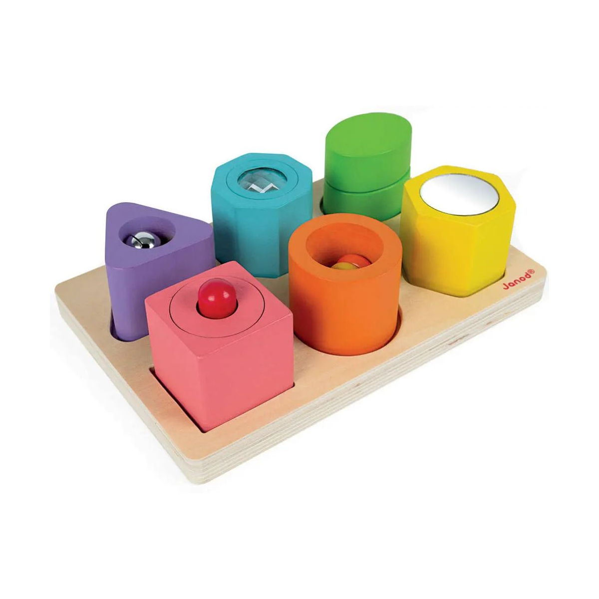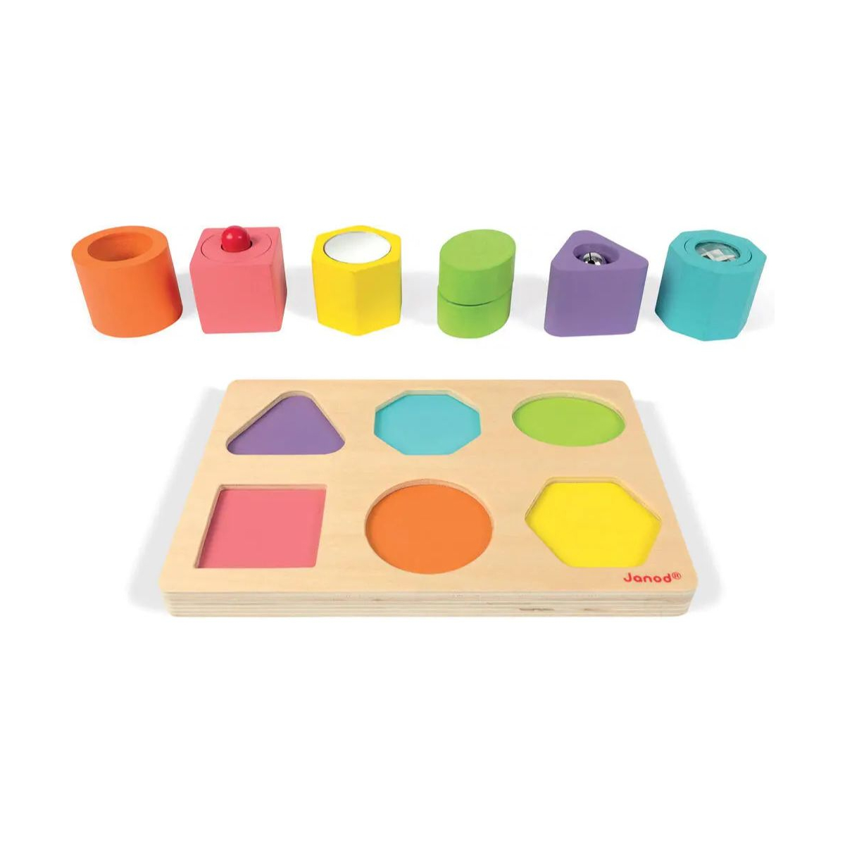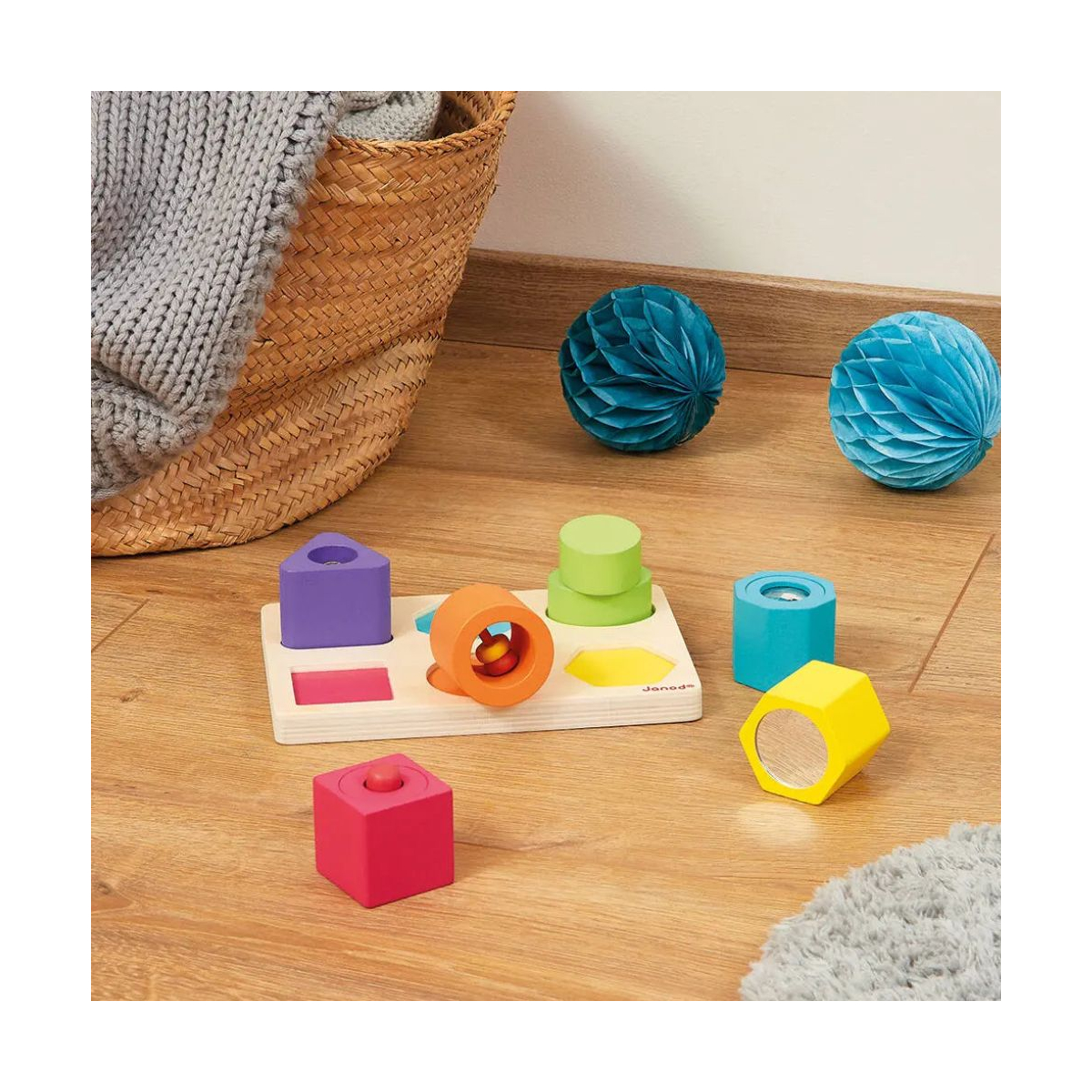 Conçu par la marque française JANOD, ce puzzle sensoriel allie qualité et durabilité. Les cubes peuvent être manipulés, empilés ou encastrés dans le socle en contreplaqué, offrant une multitude de possibilités d’exploration et de jeu. Les couleurs vives et les fonctions sensorielles variées encouragent l’apprentissage des formes, des couleurs et des sons dans un univers ludique et stimulant.