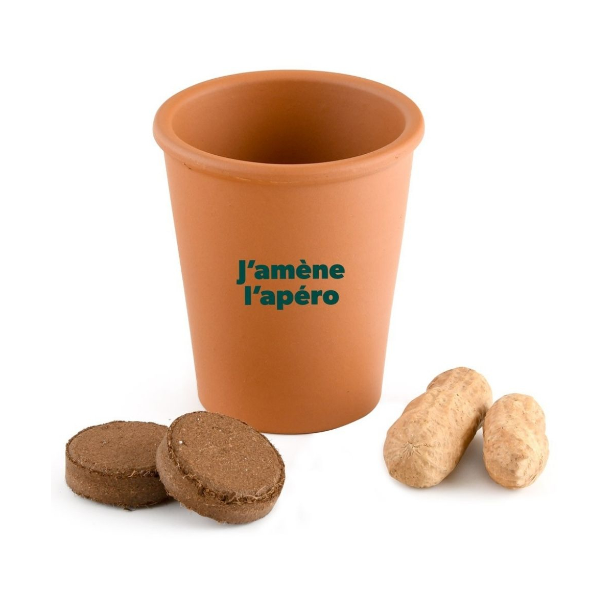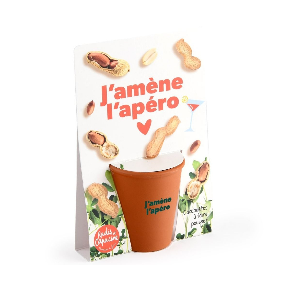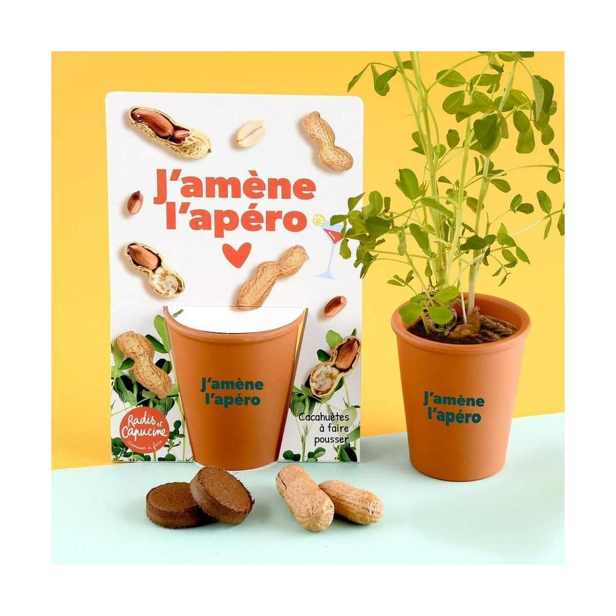 Kit jardinage "J’amène l’apéro" – pot 6 cm avec graines de cacahuètes et terreau. Faites pousser vos cacahuètes maison pour un apéro fun et gourmand.