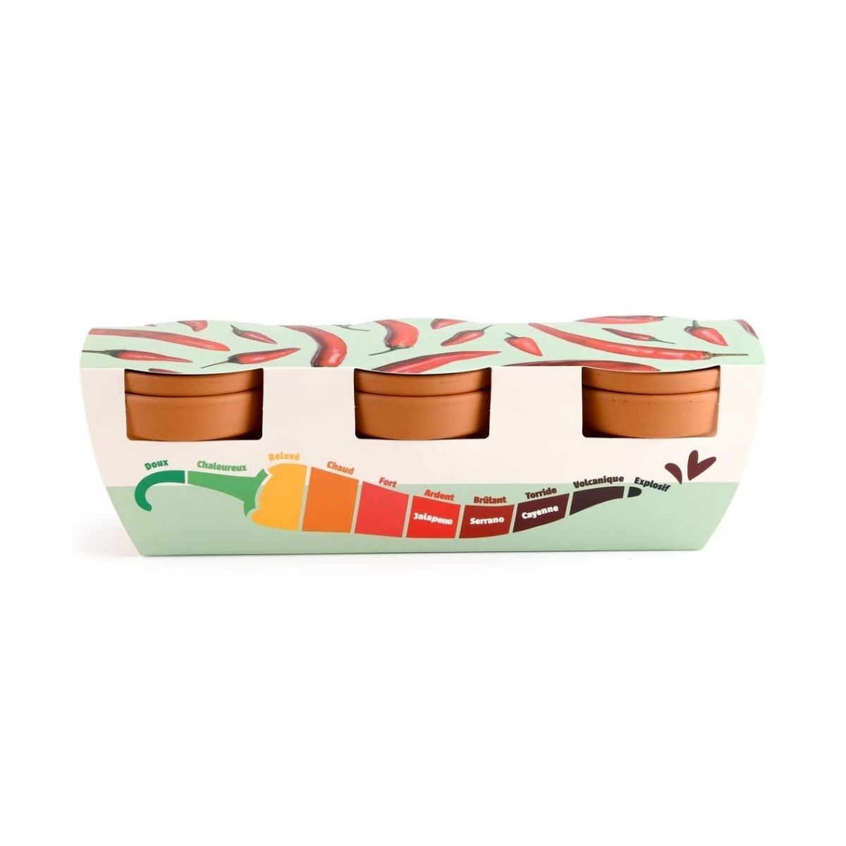 Kit jardinage Trio piments – Jalapeño, Serrano et Cayenne en pots 6 cm. Cultivez du doux au fort selon l’échelle de Scoville. Idéal pour cuisine, apprentissage et cadeau original.
