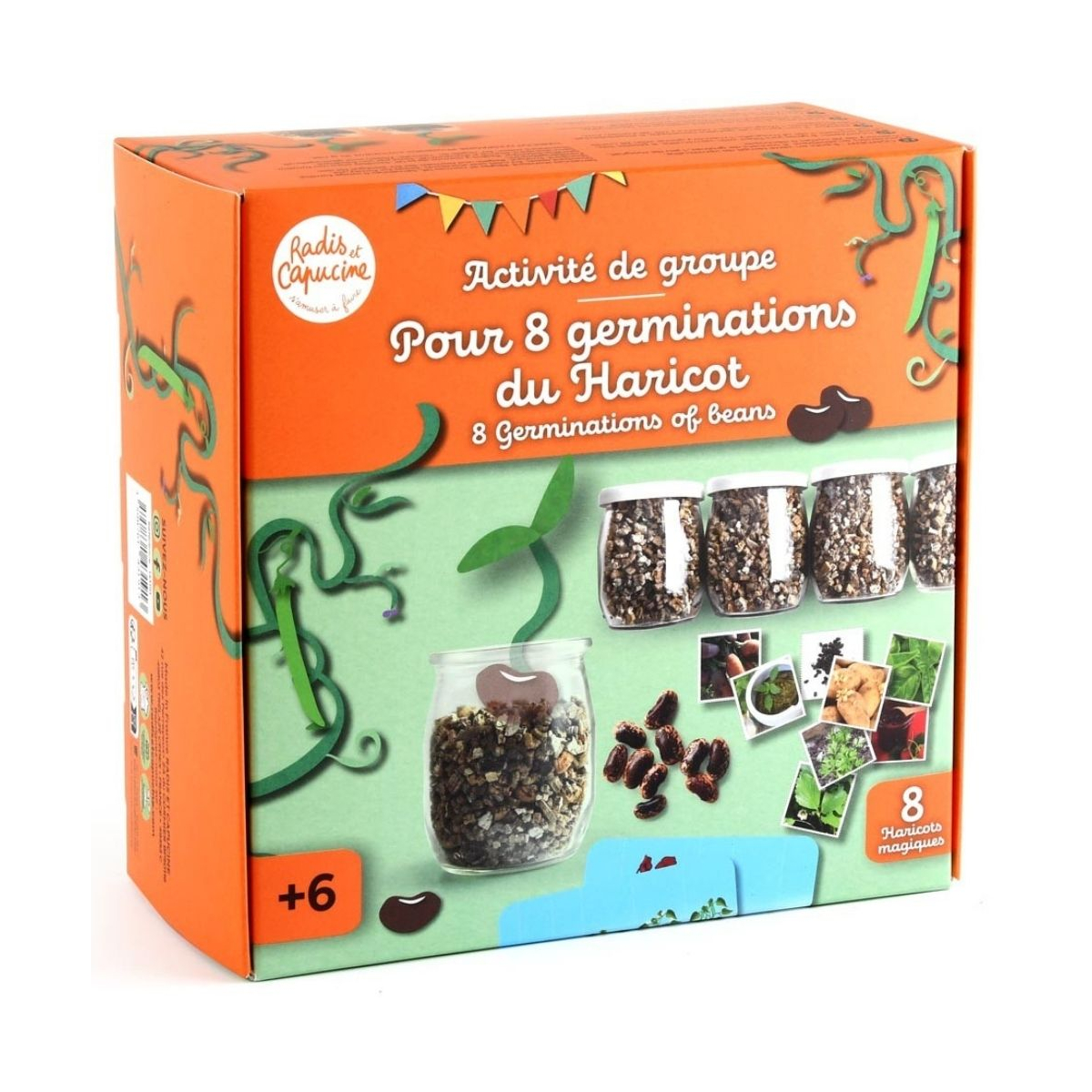 Coffret activité germination du haricot – kit pour 8 enfants. Observez ensemble la croissance des plantes, découvrez le cycle de vie et initiez au jardinage de manière ludique et scientifique.