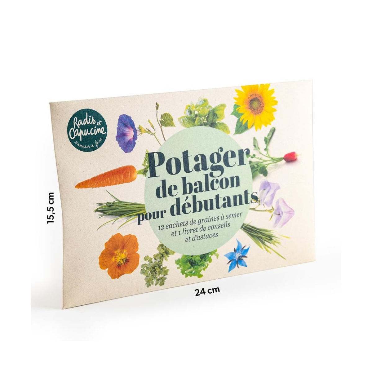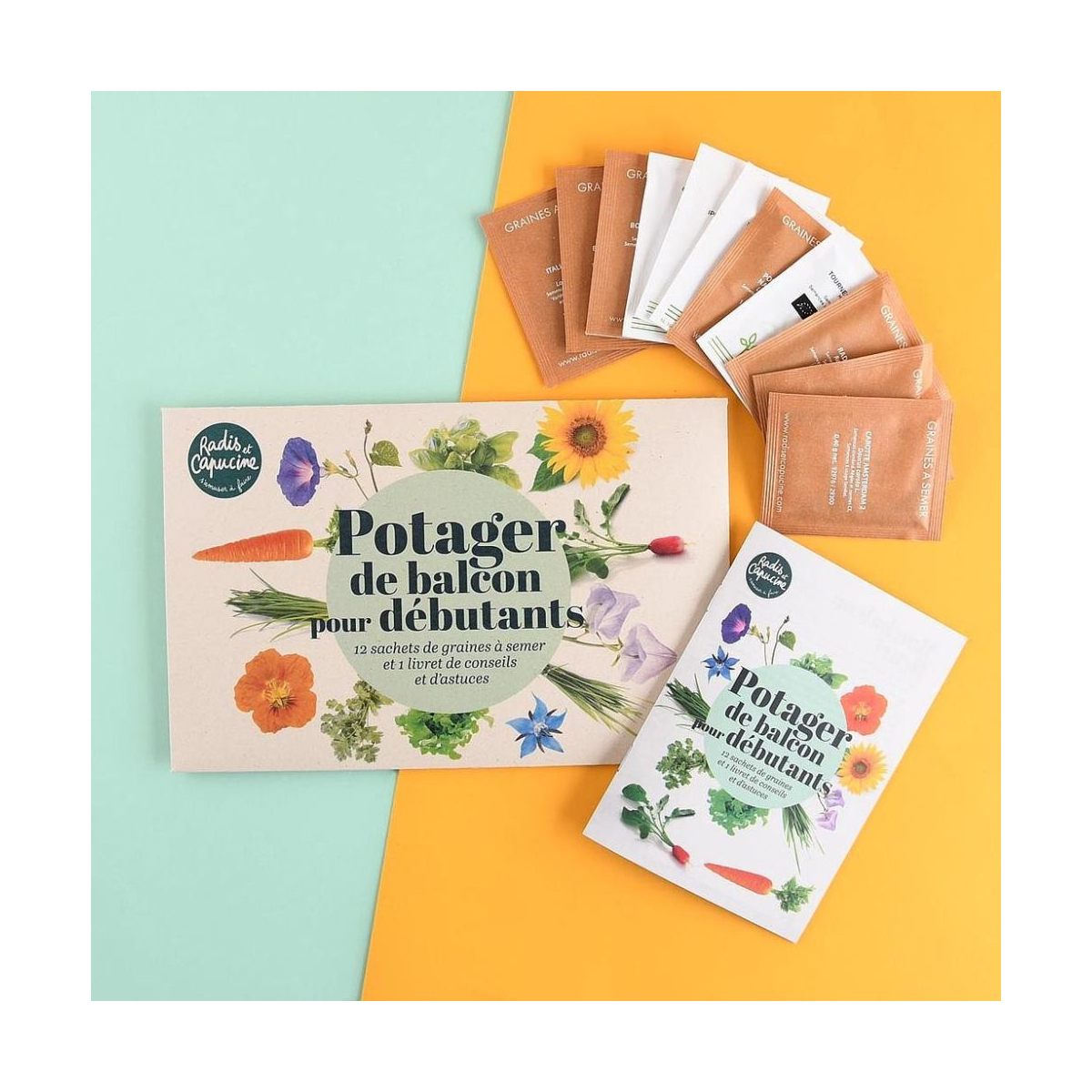 Enveloppe de 12 sachets de graines potagères pour balcon avec livret de culture. Un kit complet pour débutants, facile à semer, pour récolter légumes et aromatiques en ville.