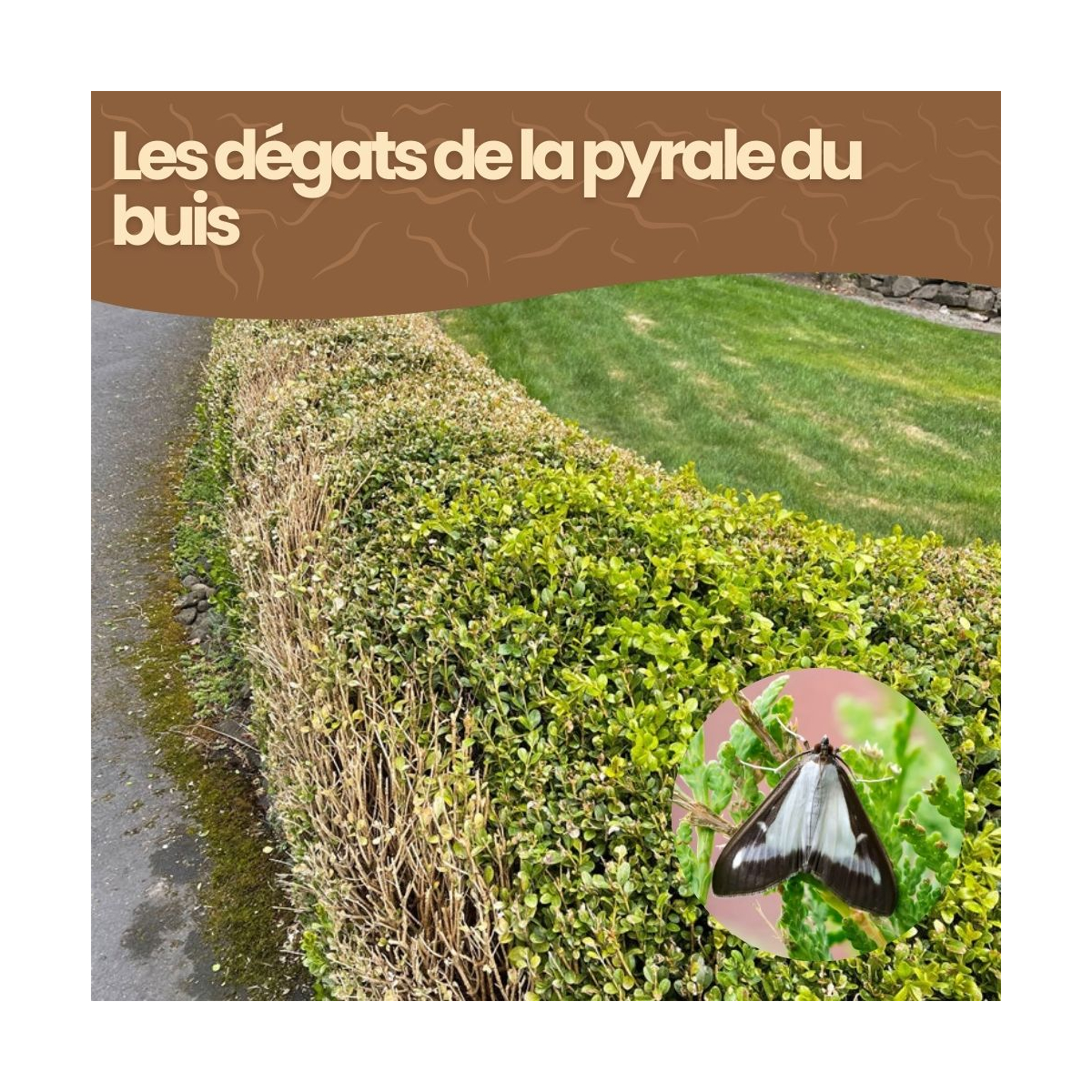 Des feuilles qui brunissent soudainement, des filaments de soie semblables à des toiles d’araignée ou des petites boulettes vertes (déjections) au pied de l'arbuste ? Il s'agit sans aucun doute de la pyrale du buis. Ce papillon nocturne est le fléau n°1 des jardins : sa chenille, d’un vert vif strié de noir peut dépouiller un buis entier en quelques jours seulement.