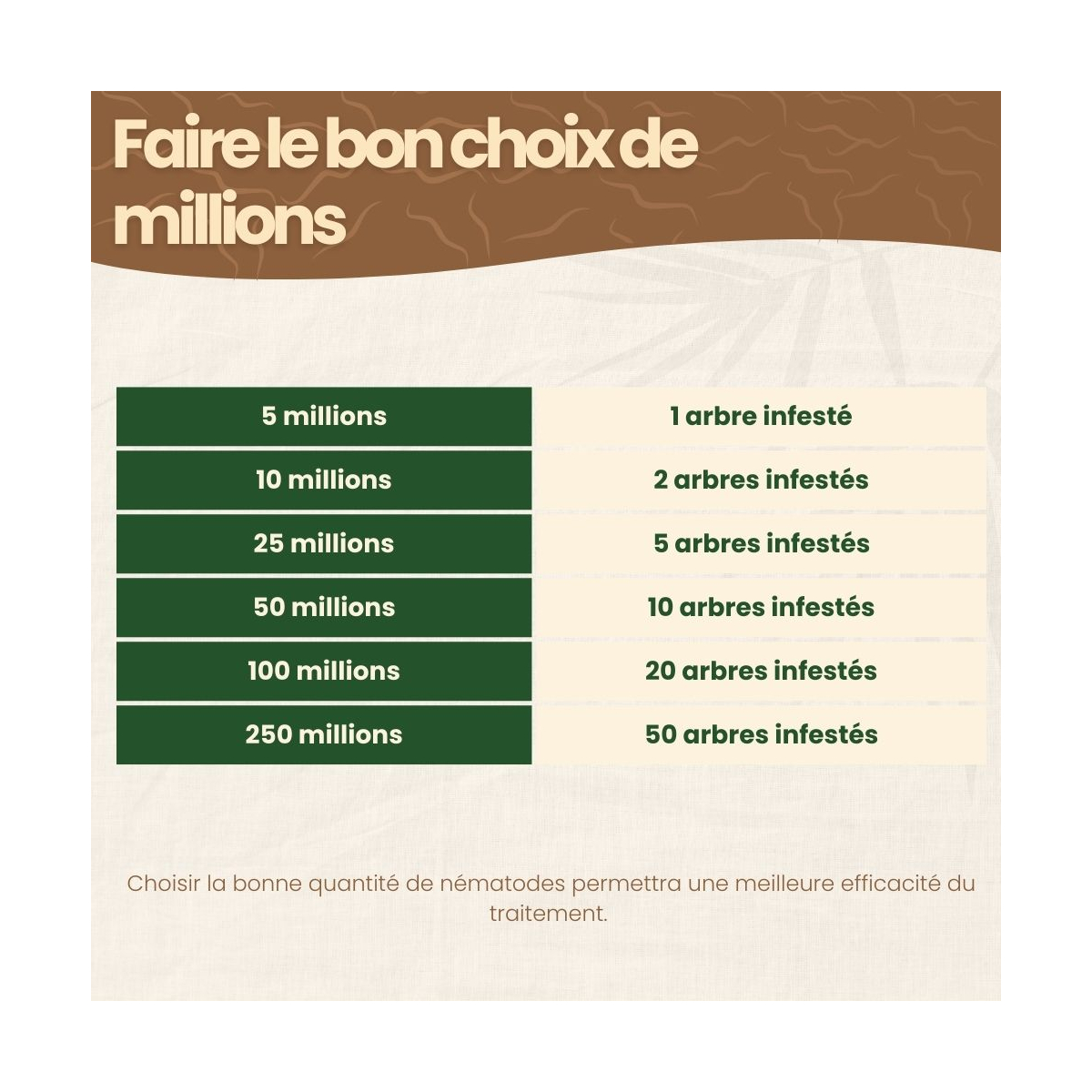 Le nombre de nématodes se définit en fonction de la zone à traiter. Attention, le produit ne se conserve pas et s’utilise en une seul fois, il est inutile de choisir une quantité supérieur afin de traiter en deux fois. Il est conseillé de renouveler son traitement quelques semaines plus tard si l’invasion est très forte.