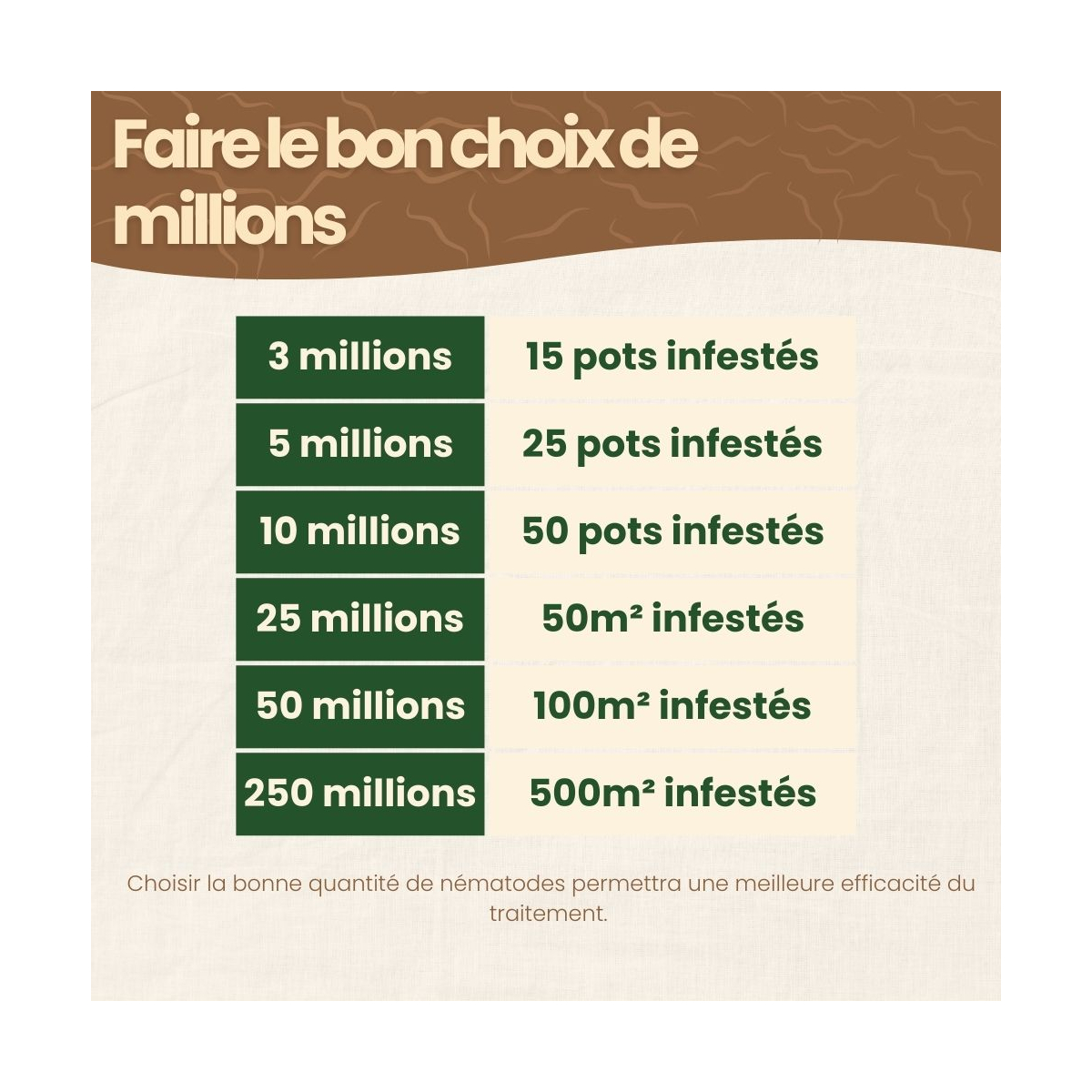 Le nombre de nématodes se définit en fonction de la zone à traiter. Attention, le produit ne se conserve pas et s’utilise en une seul fois, il est inutile de choisir une quantité supérieur afin de traiter en deux fois. Il est conseillé de renouveler son traitement quelques semaines plus tard si l’invasion est très forte.