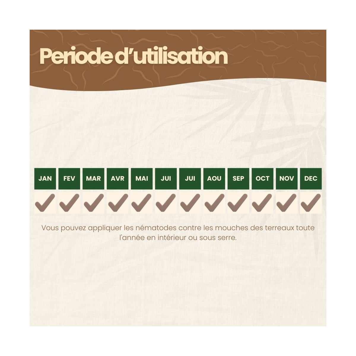 Vous pouvez appliquer les nématodes contre les mouches des terreaux toute l'année en intérieur ou sous serre.
