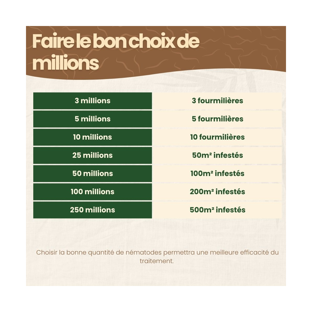 Le volume d’eau diffère selon le nombre de nématodes présent dans le sachet. Le dosage est : 200ml d’eau par million. Pour plus de facilité, vous pouvez vous référez au tableau ci-dessous.