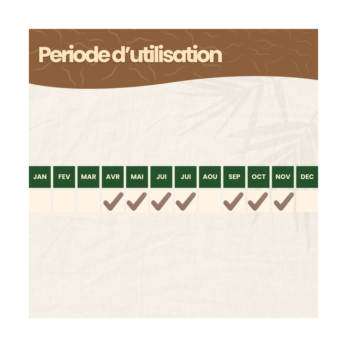 Avril à juillet (Période complémentaire) : Pour stopper les larves qui sortent de leur cachette ou les premières générations de la saison.
