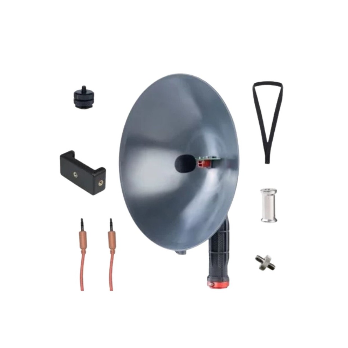 Microphone parabolique BirdMic pour amplifier et enregistrer les sons naturels à distance. Directionnel, compact et simple d’utilisation, idéal pour l’écoute et l’enregistrement sonore sur le terrain.