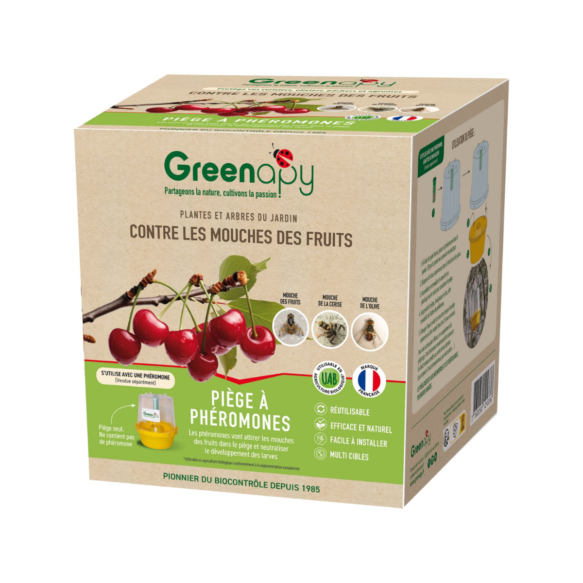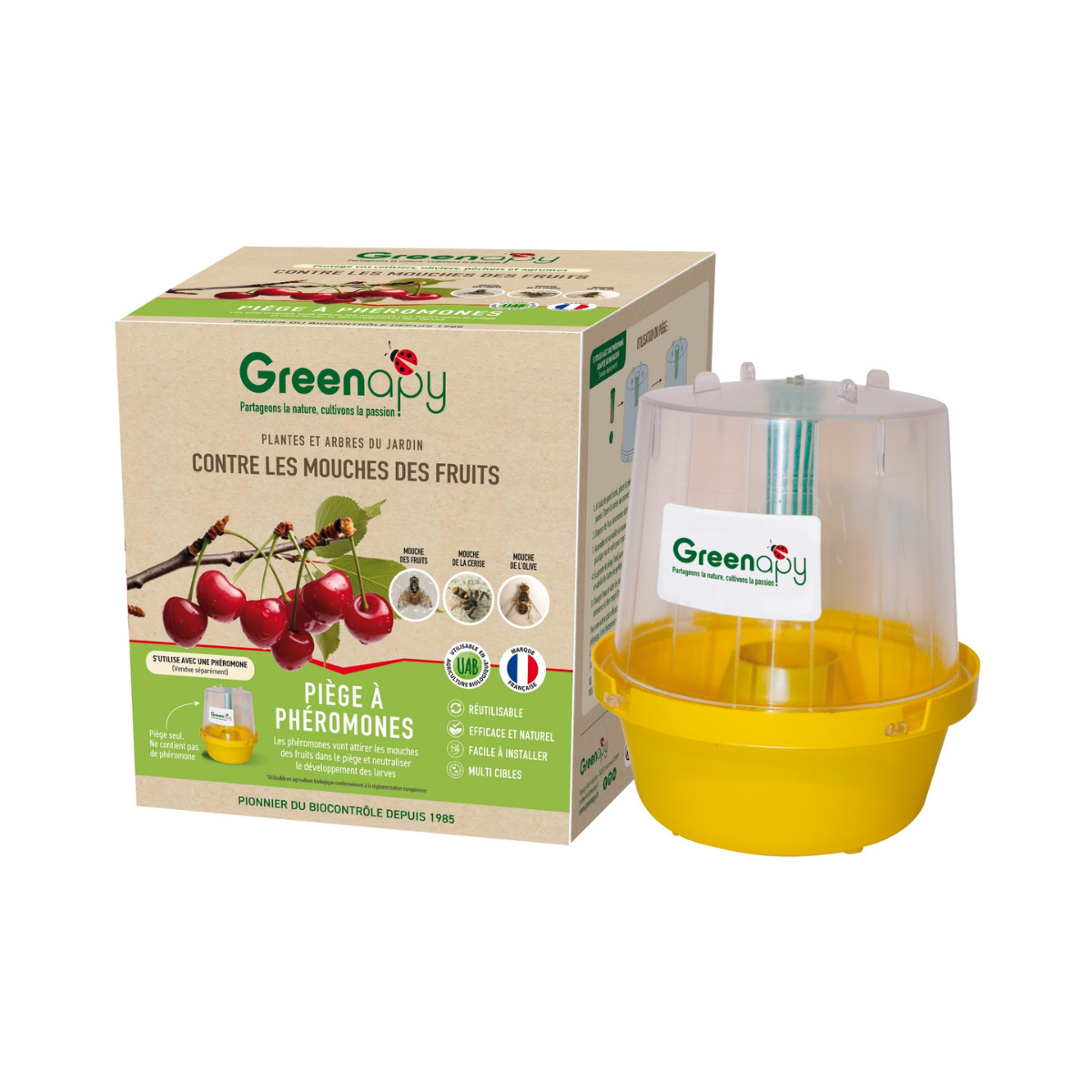 Ce piège cible la mouche de la cerise, la mouche de l'olive, la mouche méditerranéenne des fruits et les mouches domestiques.
