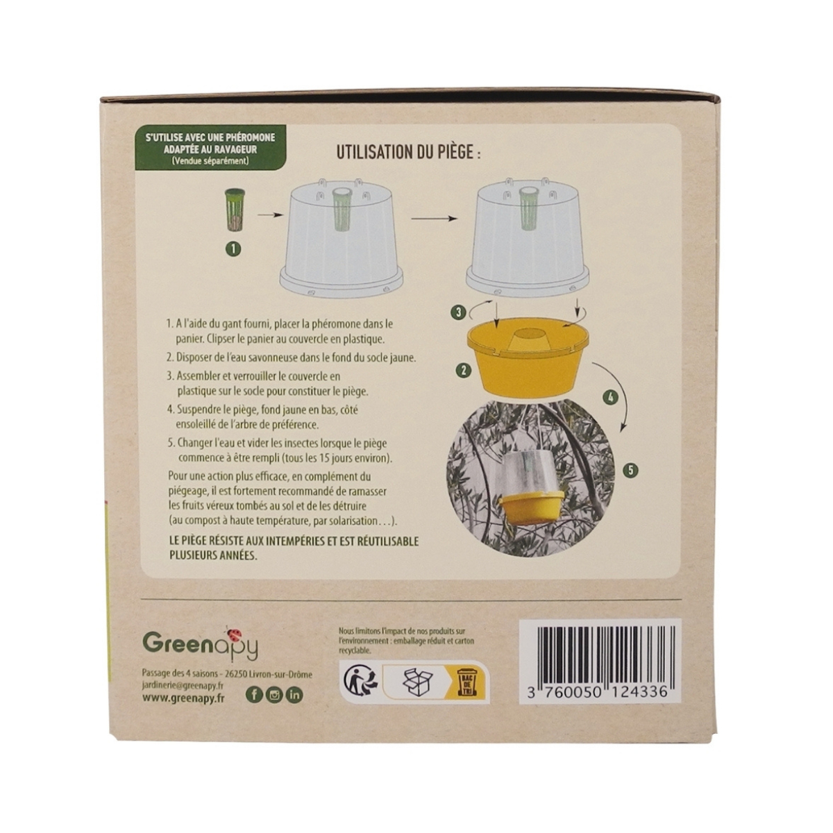 Le piège, par l’ajout d’une capsule de phéromone spécifique (attractif), attire à distance les papillons mâles.