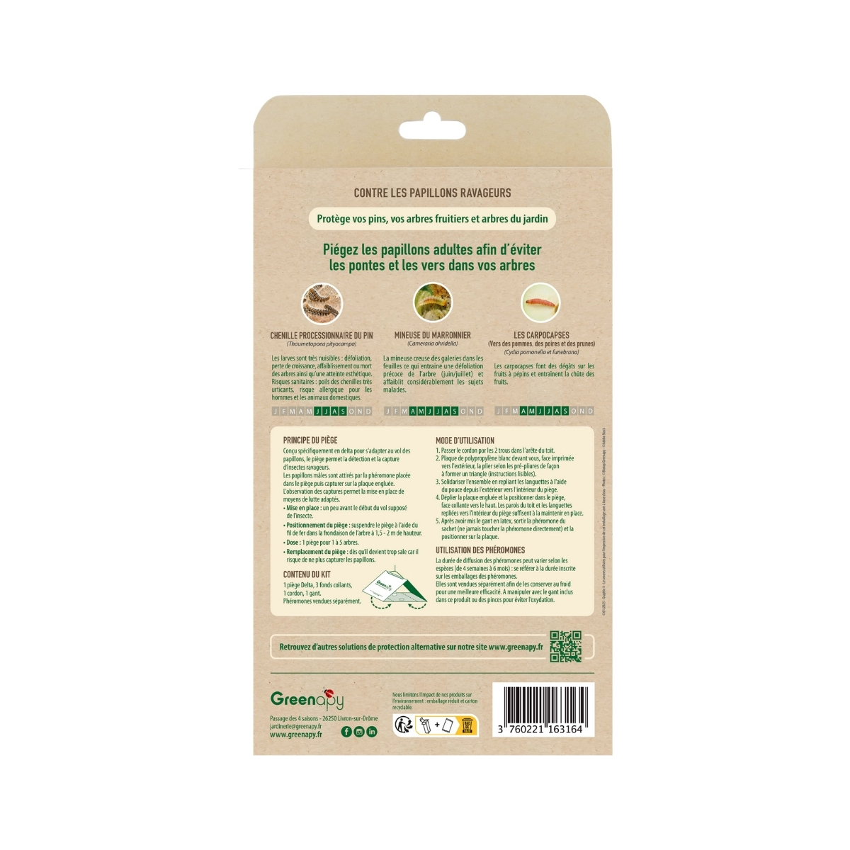 Le Piège Delta est un outil indispensable pour détecter la présence de papillons ravageurs sur vos cultures. Que ce soit pour les mineuses du marronnier, les processionnaires, les carpocapses ou d'autres papillons, le Piège Delta est capable de détecter leur présence efficacement.
