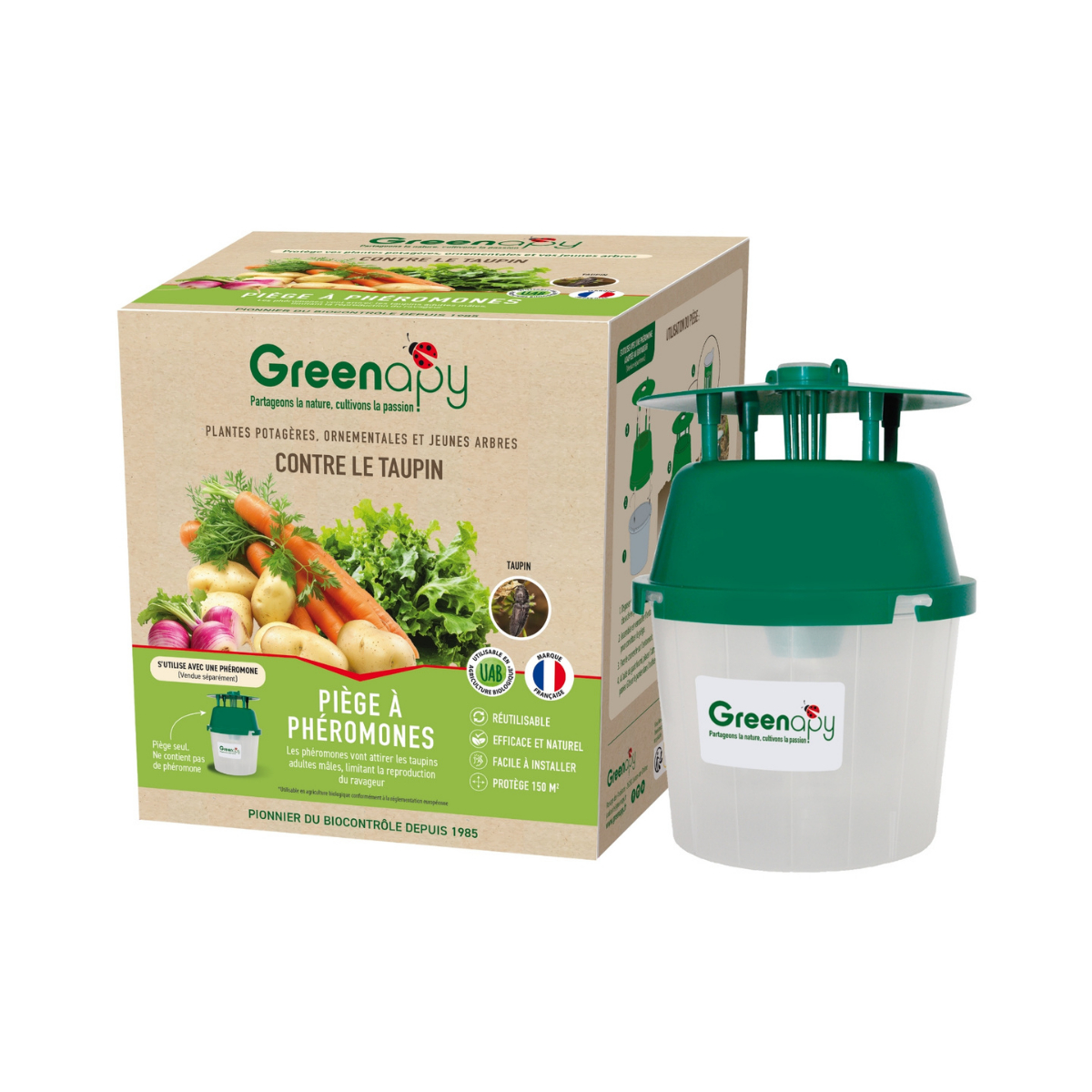 Le piège anti taupin à phéromone se compose d'un entonnoir en plastique, d'un flacon de phéromone et d'un récipient pour les captures. La phéromone est placée dans le flacon et émet un signal odorant qui attire les taupins mâles vers le piège. Les taupins entrent ensuite dans l'entonnoir et tombent dans le récipient de capture où ils sont piégés.