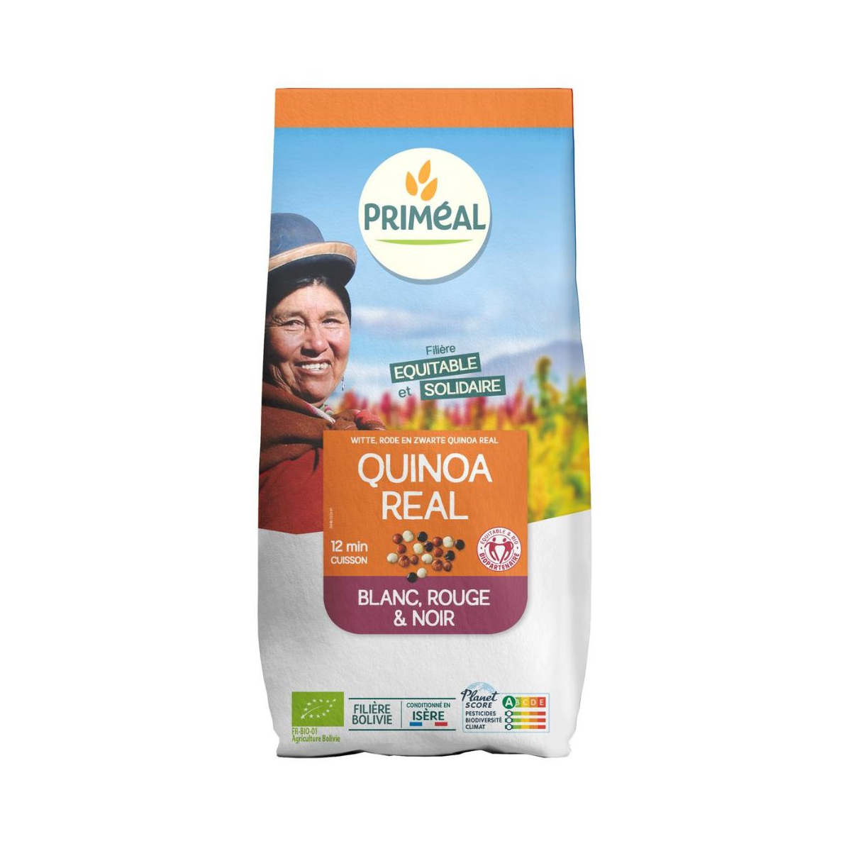 Ingrédients: Quinoa Real* (blanc*, rouge* et noir*) (1)*issus de l’agriculture biologique(1) 100% du total des ingrédients d'origine agricole sont issus du commerce équitable contrôlé selon le référentiel FIABLE.