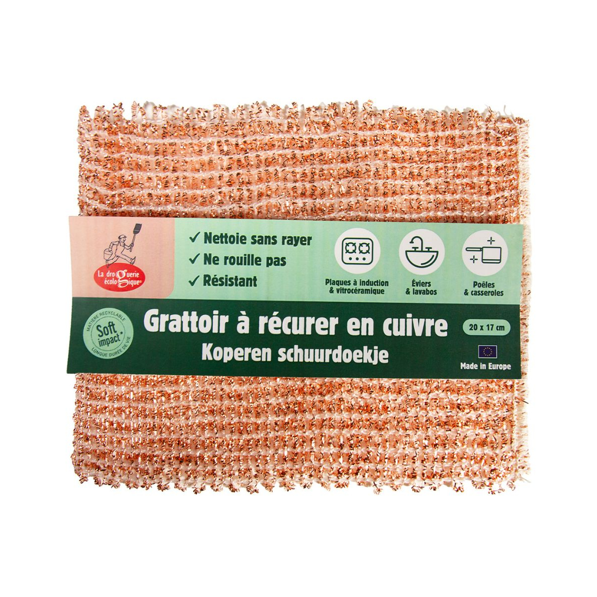 Nettoyez vos surfaces sans les rayer avec le grattoir cuivre grand format 20x17 cm, durable, recyclable et fabriqué en Europe pour un entretien doux et écologique.